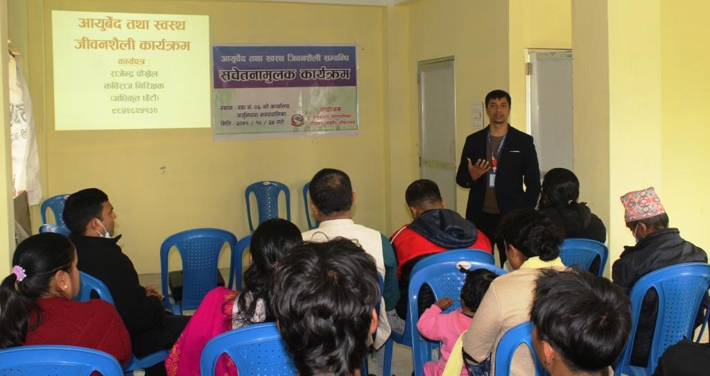 वडाध्यक्ष हरिशचन्द्र बाँस्तोलाको अध्यक्षतामा आयोजित कार्यक्रममा सहभागीहरुलाई आयुर्वेदको परिचय र महत्व, आयुर्वेद सम्बन्धी सरकारी संस्थाहरुबाट पाइने सेवा र संरचनाहरुको अवस्था, खानपिन, योग, व्यायामलगायतका विषयमा सहजिकरण गरिएको थियो ।