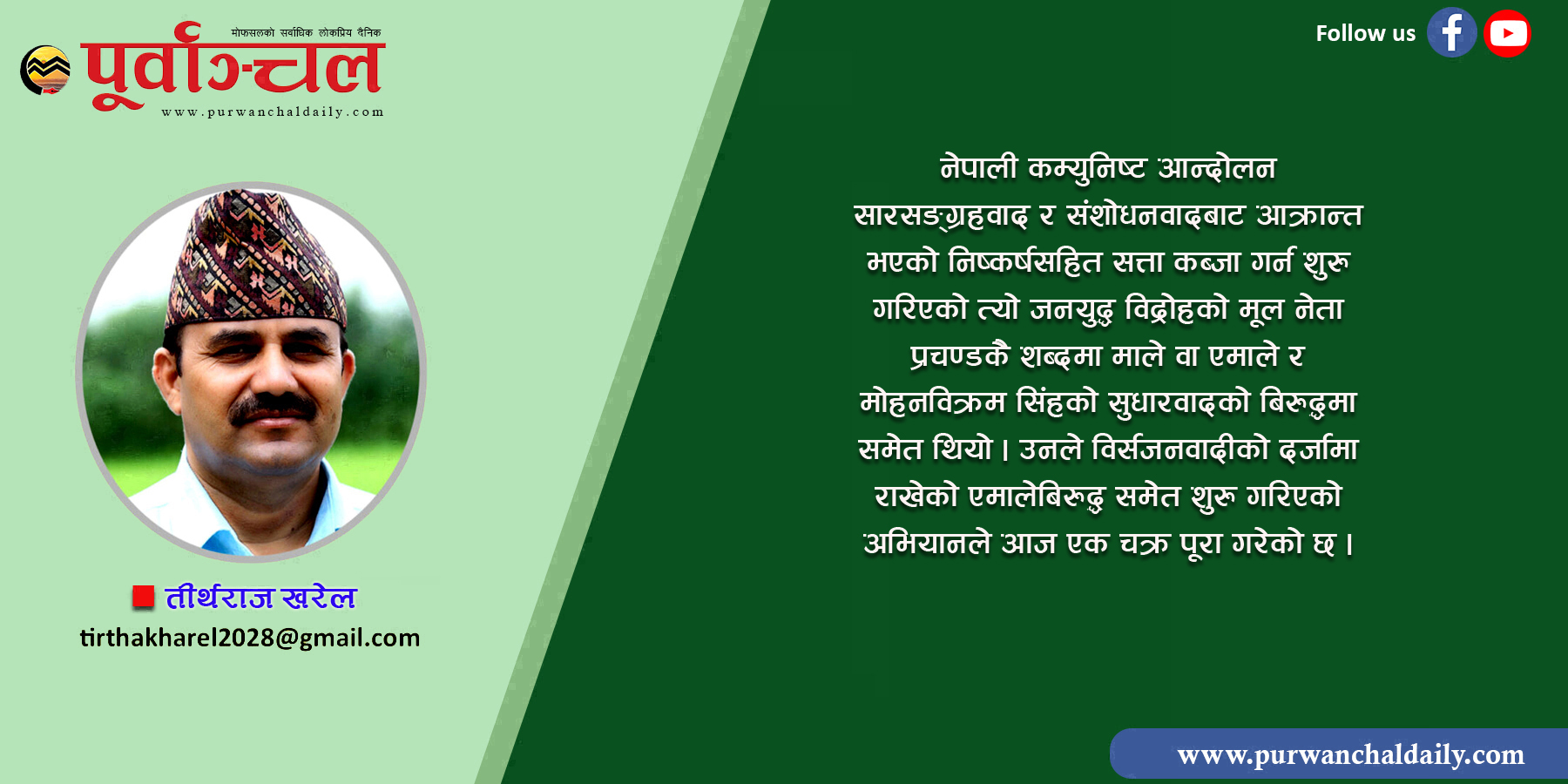 क्रान्तिका सपना बाँडेर क्रान्ति पूरा हुँदैन । बन्दूक पड्काउँदैमा र हतियार उठाउँदैमा दाम्रिएको पेट र चाउरिएको गालामा क्रान्तिका लाली चढ्दैन । वीरतापूर्ण सशस्त्र संघर्षको तुफानी ज्वारभाटाबाट गुज्रेका माओवादीहरू देखावटी रूपमा जनयुद्ध सम्झिरहेका छन् वा ती दिनहरूलाई बिर्सन चाहिरहेका छन् । मुलुकका सामु उभिएका विराट चुनौति र महान् सम्भावनाको बारेमा घोत्लिएर एउटा नयाँ मार्गनिर्देशनका लागि नयाँ विचार निर्माण गर्न खाँचो छ । वर्गीय, जातीय, क्षेत्रीय, लैङ्गिक, भाषिक लगायतका नेपाली समाजमा रहेका विभेदलाई सदाका लागि अन्त्य गर्न कम्युनिष्टहरूले जडसूत्रवादलाई त्याग्न आवश्यक छ र माक्र्सवादको सारतत्वलाई नेपाली माटोमा सृजनात्मक रुपमा ग्रहण गर्दै युगसापेक्ष लोकतान्त्रिक प्रक्रियाबाट अघि बढ्न जरुरी छ ।