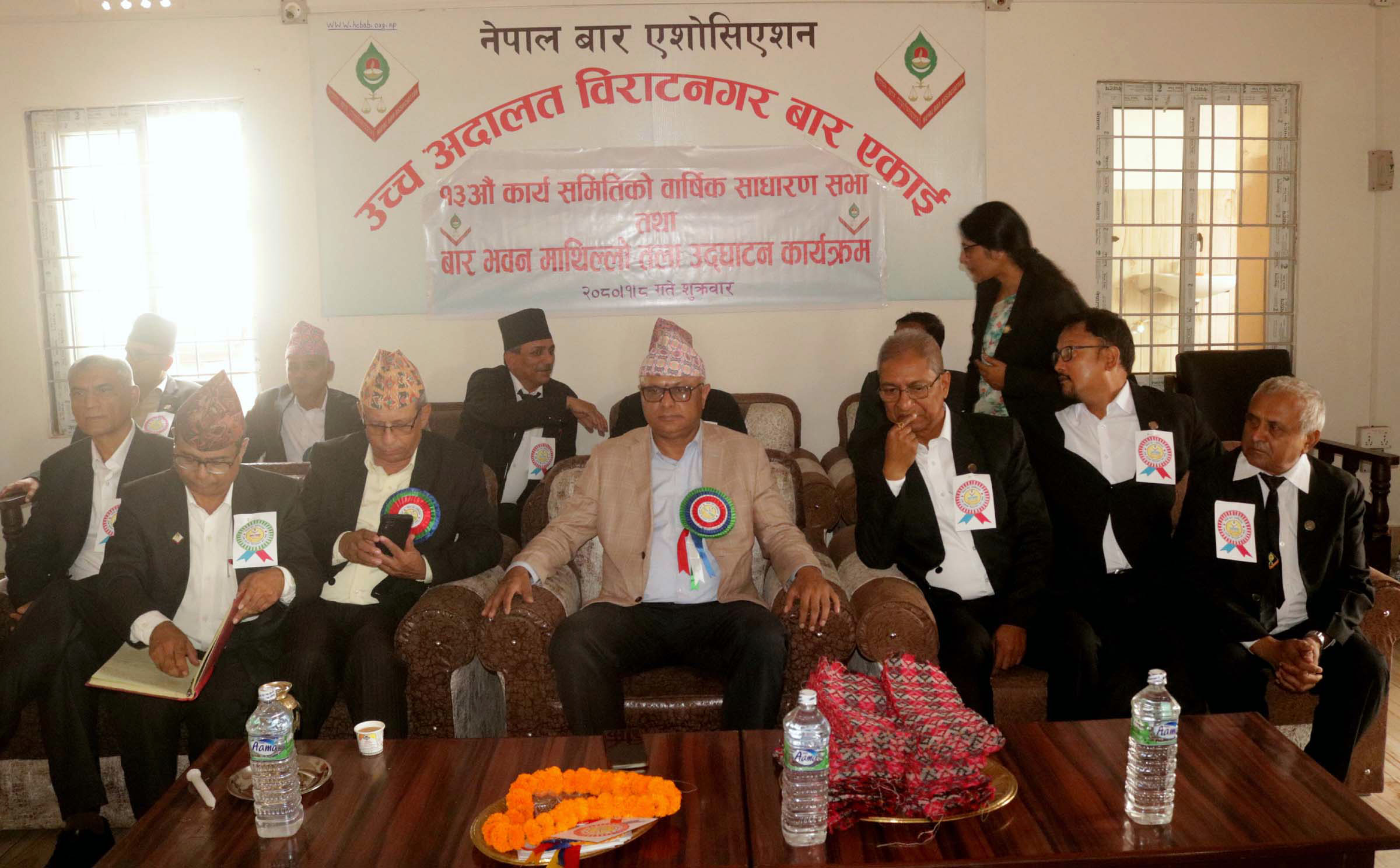 बार एकाइका अध्यक्ष नारायणप्रसाद दाहाल, पूर्वप्रदेश मुख्य न्यायाधिवक्ता चूडामणि आचार्य, पूर्वअध्यक्ष रमेश कोइराला, सुनसरी बार सचिव, पार्षद प्रेमप्रसाद पोखरेल, वीरेन्द्रप्रसाद गौतम, अनिल खड्का र भवन निर्माण संयोजक सुरेशलाल श्रेष्ठले कानून व्यवसायीहरूबीच विवाद, समाधान र एकता कायम राखी नागरिकलाई न्यायालयप्रति आस्था एवं विश्वास कायम गराउन महत्त्वपूर्ण भूमिका निर्वाह गर्नुपर्ने धारणा राख्नुभयो । प्रदेश सरकारको रु ४० लाख सहयोगमा बारको माथिल्लो तलाको सभा हलसहित भवन निर्माण गरिएको हो ।