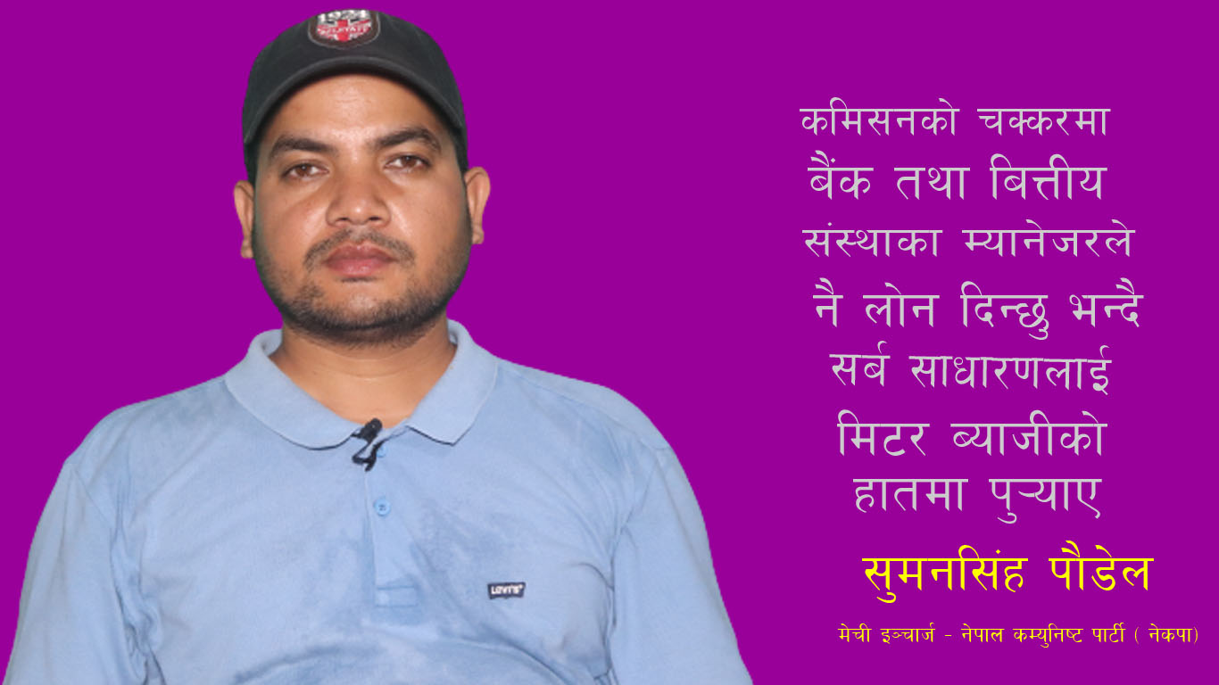 झापा, नेपाल कम्युनिष्ट पार्टी ( नेकपा) का केन्द्रीय सदस्य तथा मेची ब्यूरो इञ्चार्ज सुमनसिंह पौडेलले बैंक तथा बित्तीय संस्थाका प्रमुख नै मिटरव्याजी रहेको आरोप लगाएका छन् ।