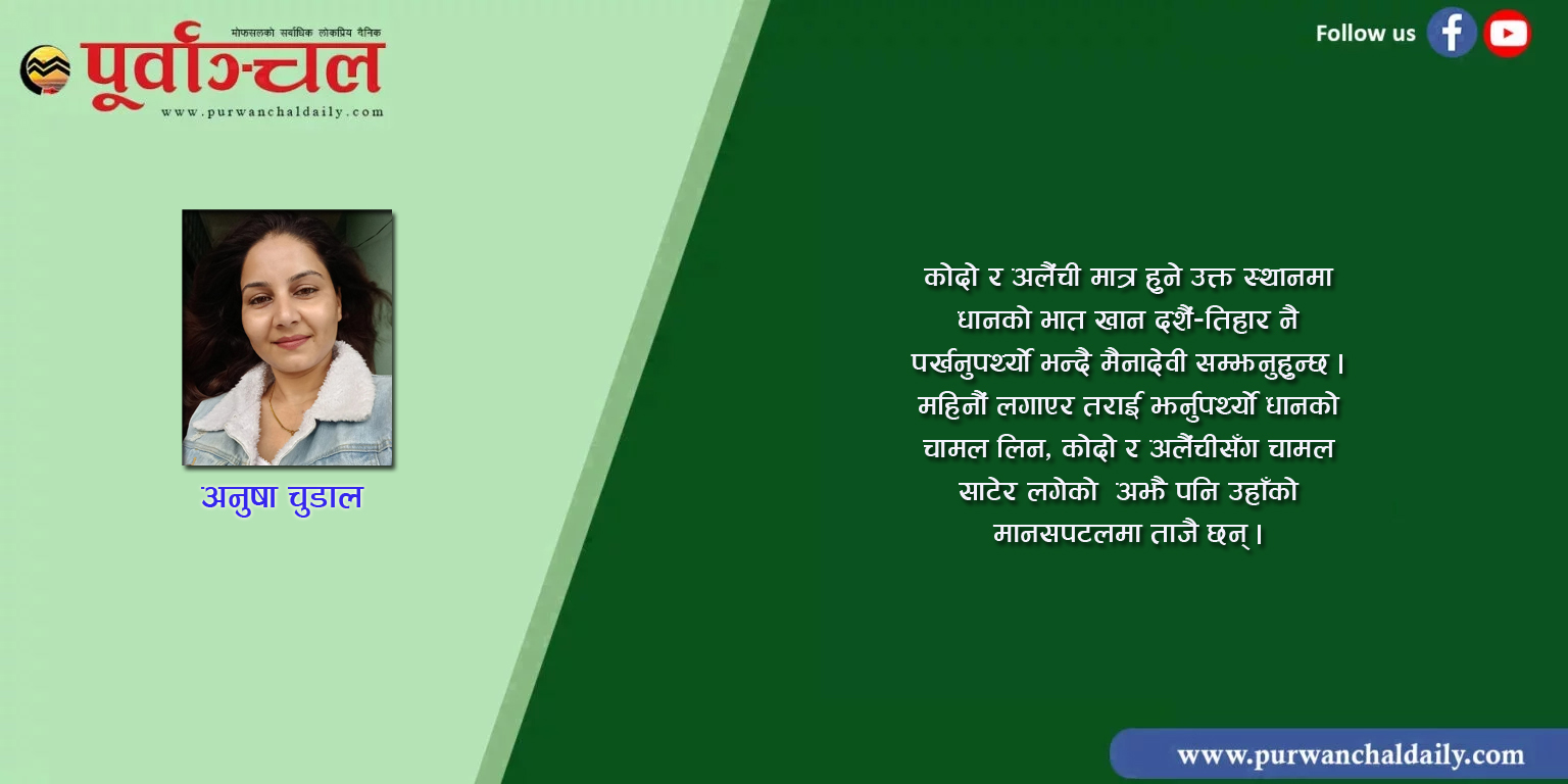 कोदो र अलैंची मात्र हुने उक्त स्थानमा धानको भात खान दशैं–तिहार नै पर्खनुपथ्र्यो भन्दै मैनादेवी सम्झनुहुन्छ । महिनौं लगाएर तराई झर्नुपथ्र्यो धानको चामल लिन, कोदो र अलैंचीसँग चामल साटेर लगेको अझै पनि उहाँको मानसपटलमा ताजै छन् । आधा जिन्दगीभन्दा कम्ती उमेरमा श्रीमानको निधन भयो ।