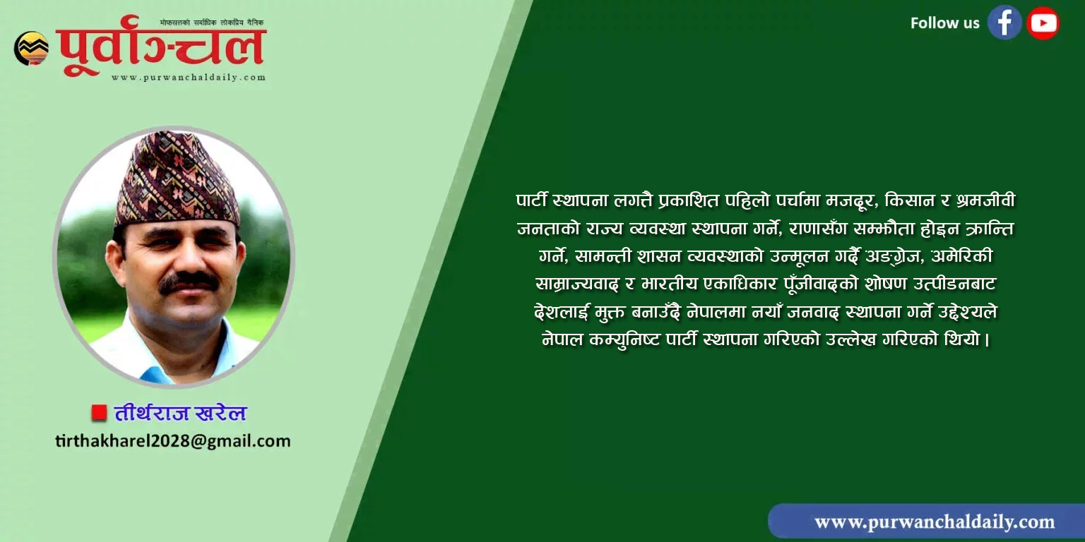 तत्कालीन सामन्ती–जहाँनिया राणाशासनको दबदबा भएको बखत राजनीतिक गतिविधि गर्न प्रतिबन्ध भएको अवस्थामा सामन्ती सत्तालाई अन्त्य गरी नयाँ जनवादी सत्ता स्थापना गर्ने उद्देश्यका साथ कमरेड पुष्पलालको अदम्य साहस र वैचारिक दृष्टिकोणको प्रकाशमा नेपालमा कम्युनिष्ट पार्टीको स्थापना भएको थियो । पार्टी स्थापना लगत्तै प्रकाशित पहिलो पर्चामा मजदूर, किसान र श्रमजीवी जनताको राज्य व्यवस्था स्थापना गर्ने, राणासँग सम्झौता होइन क्रान्ति गर्ने, सामन्ती शासन व्यवस्थाको उन्मूलन गर्दै अङ्ग्रेज, अमेरिकी साम्राज्यवाद र भारतीय एकाधिकार पूँजीवादको शोषण उत्पीडनबाट देशलाई मुक्त बनाउँदै नेपालमा नयाँ जनवाद स्थापना गर्ने उद्देश्यले नेपाल कम्युनिष्ट पार्टी स्थापना गरिएको उल्लेख गरिएको थियो ।
