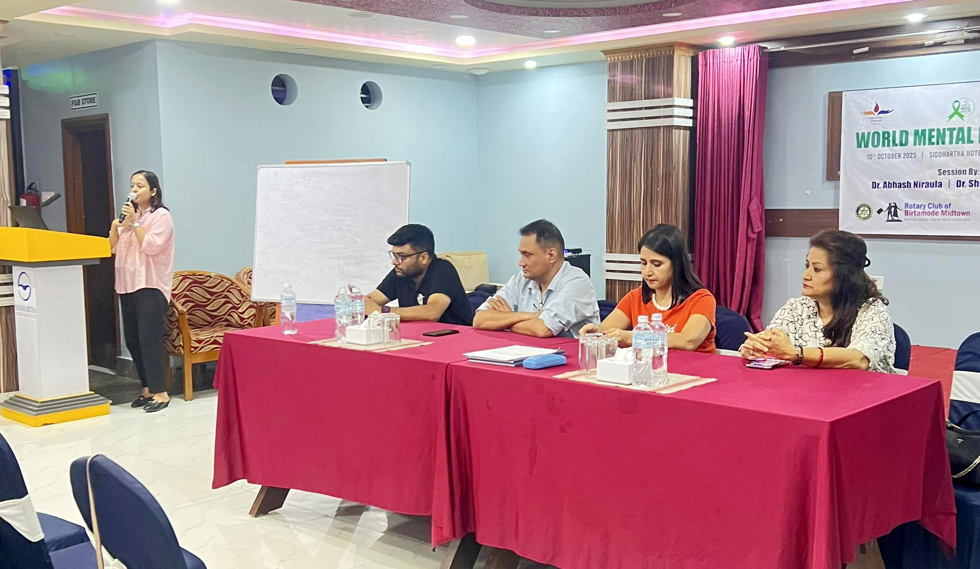 रोटरी क्लव अफ बिर्तामोड मिडटाउनले विश्व मानसिक स्वास्थ्य दिवसका अवसर पारे झापाको बिर्तामोड स्थित बिर्ता सिटी अस्पतालका मानसिक रोग विशेषज्ञ डाक्टर आभाष निरौला र बीएण्डसी अस्पतालका डाक्टर श्रद्धा भण्डारीले मानसिक स्वास्थ्यसँग जोडिएका विषयलाई न्यूनीकरण गर्न मानिसले गर्नुपर्ने काम तथा रोगको पहिचान कसरी गर्न सकिन्छ भन्ने विषयमा सहभागिहरुलाई बुझाएका थिए ।
