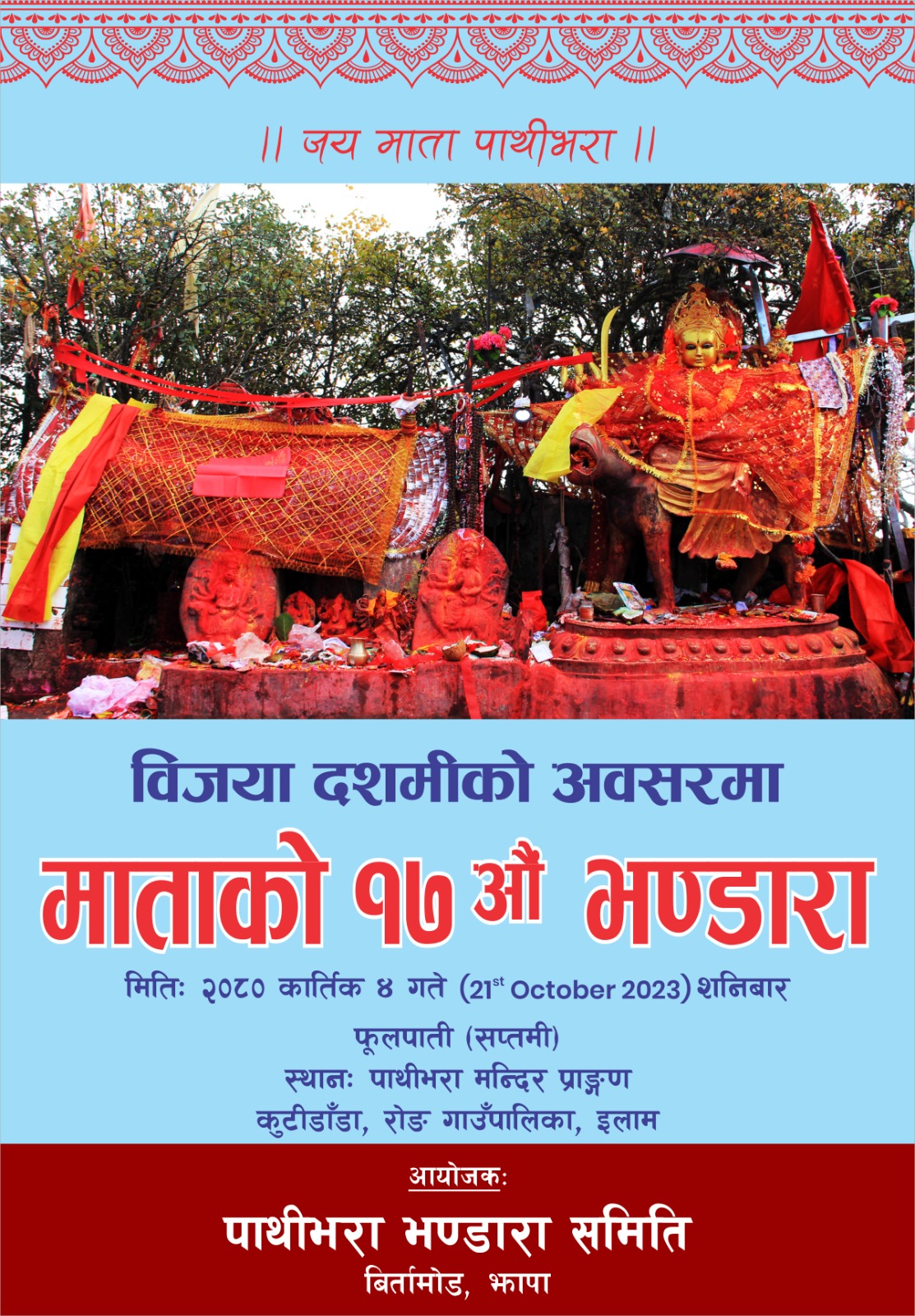दशैको सन्दर्भ पारेर झापाका ब्यपारीहरुको समुह पाथीभरा भण्डरा समिति बिर्तामोडले प्रसाद बितरण कार्यक्रम आयोजना गर्न लागेको हो । यो १७ औ पटकको भण्डारा हो ।