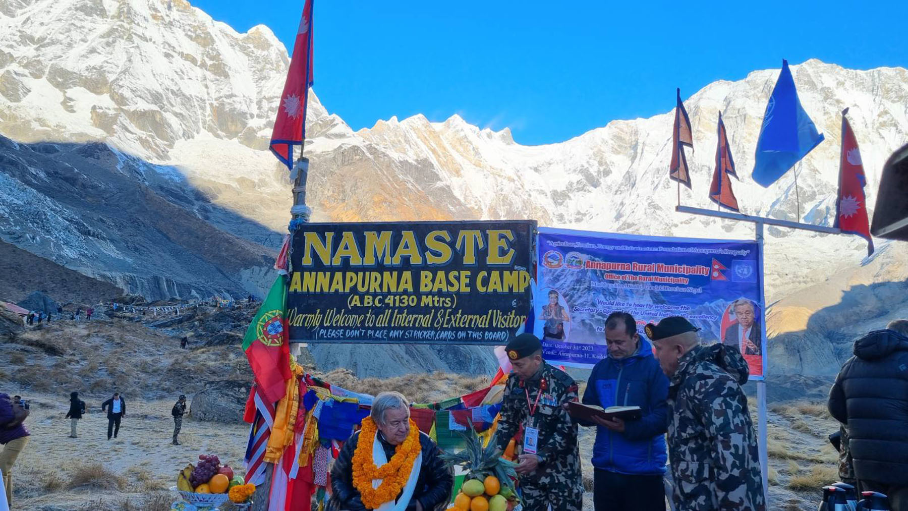 यसैगरी महासचिव गुटेरेसले आज अन्नपूर्ण आधारशिविर पुगेर नेपालमा जलवायु परिवर्तनको असर न्यूनीकरणका लागि सहयोग गर्ने प्रतिबद्धता व्यक्त गर्नुभएको थियो । उहाँले विकसित तथा औद्योगिक राष्ट्रका कारण जलवायु परिवर्तन भइरहेको बताउँदै विश्वव्यापी तापमान वृद्धिका कारण हिमाली शृङ्खलाको हिउँ दिनप्रतिदिन घटिरहेको उल्लेख गर्नुभयो । धनी तथा औद्योगिक राष्ट्रलाई जलवायु परिवर्तनको असर न्यूनीकरण हुने गरी प्रविधि तथा उपाय अपनाउन आह्वान गर्दै उहाँले नेपालमा परिरहेको जलवायु परिवर्तनको असर न्यूनिकरणमा सहयोग गर्न आग्रहसमेत गर्नुभयो ।