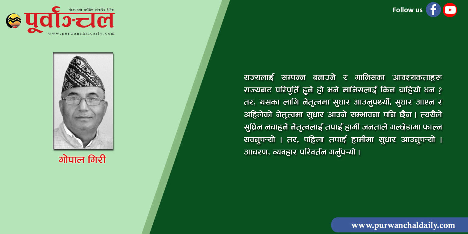 राज्यलाई सम्पन्न बनाउने र मानिसका आवश्यकताहरू राज्यबाट परिपूर्ति हुने हो भने मानिसलाई किन चाहियो धन ? तर, यसका लागि नेतृत्वमा सुधार आउनुपथ्र्यो, सुधार आएन र अहिलेको नेतृत्वमा सुधार आउने सम्भावना पनि छैन । त्यसैले सुध्रिन नचाहने नेतृत्वलाई तपाई हामी जनताले गल्छेडामा फाल्न सक्नुप¥यो । तर, पहिला तपाई हामीमा सुधार आउनुप¥यो । आचरण, व्यवहार परिवर्तन गर्नुप¥यो । हामी सबै नेता र राजनीतिक दलका कार्यकर्ता होइनौं । जब हामी सबै दलका कार्यकर्ता हुन्छौं । गलत नेतृत्वले तपाई हामी माथि अनावश्यक निर्देशन लाद्छ र तपाई–हामी, टाउको अर्कैलाई बेचिसकेका नेताका झोले बन्न पुग्छौं । राज्यले त नागरिकलाई उत्साहित बनाउने हो । ऊर्जाशील बनाउने हो ।