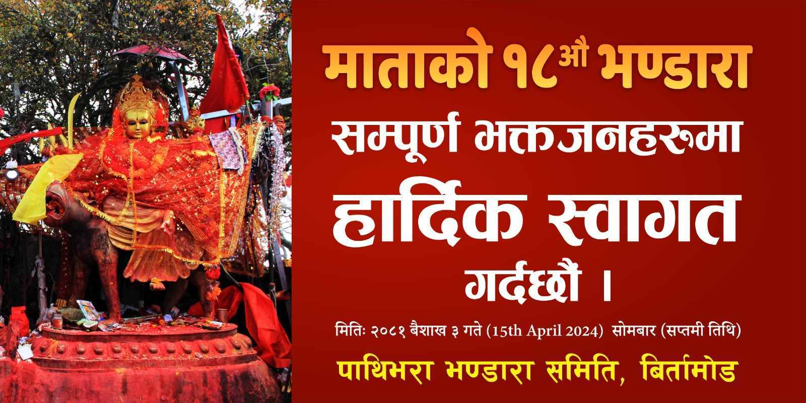 हरेक बर्ष असोज शुक्ल पक्ष र चैत्र शुक्ल पक्ष मा यो भण्डरा आयोजना हुदै आएको भण्डरा यस बर्ष यही बैसाख ३ गते सोमबार सप्तमी तिथि पारेर मन्दिर परिसरमा भण्डरा लगाउने आयोजक समितिका सदस्य सन्तोष अग्रवालले बताउनुभयो । ब्यपारी समुहले आम्दानीको केही हिस्सा संकलन गरेर सामाजिक क्षेत्रमा लगाउने गरेको छ ।