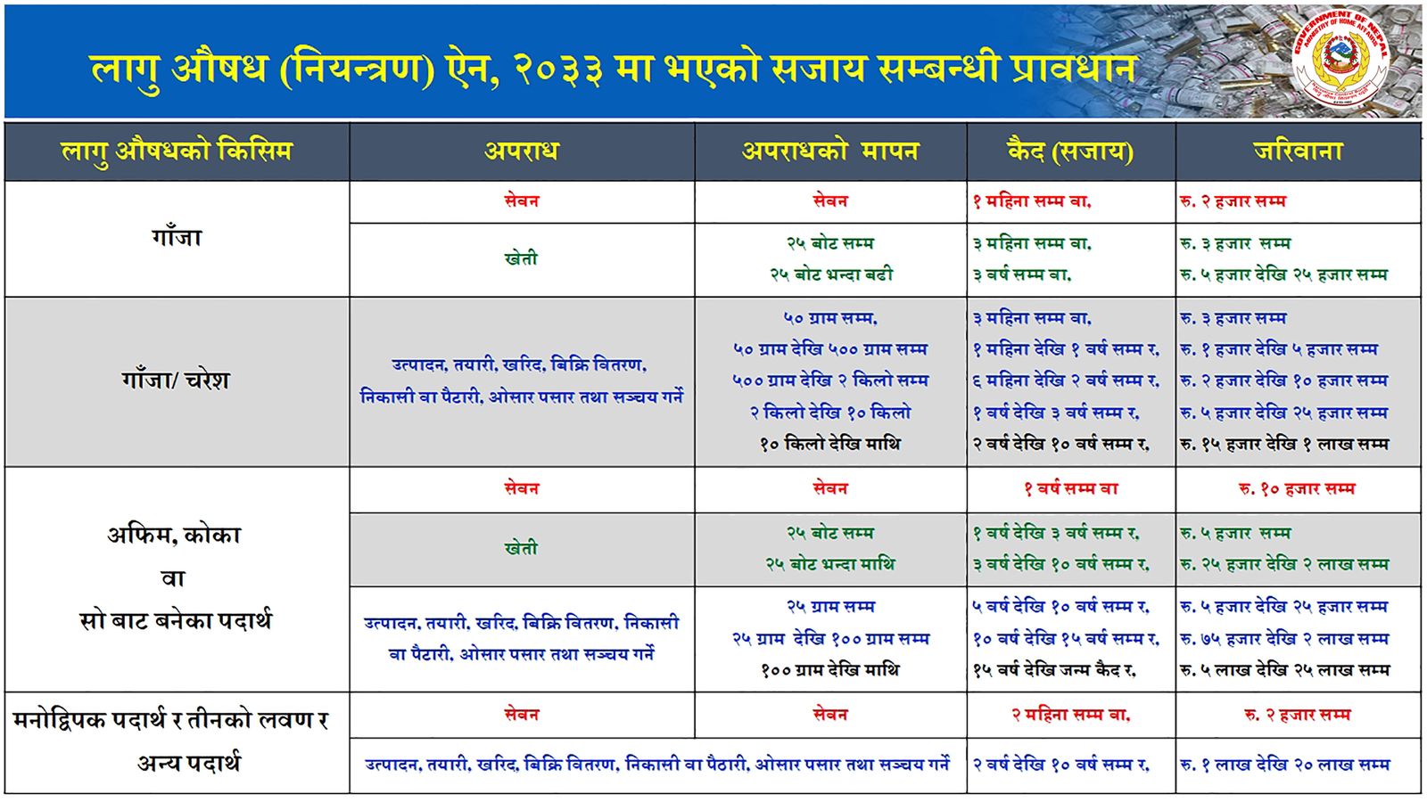 कानूनी दृष्टिकोणले हेर्दा तस्करहरूलाई कडा सजाय र प्रयोगकर्तालाई सुधारमुखी दृष्टिकोणबाट पुनःस्थापनामा लैजानु उपयुक्त हुन्छ । मेडिकल स्टोर तथा फार्मेसीहरूको नियमन र निगरानी प्रणाली पनि मजबुत बनाउनुपर्ने देखिन्छ ।