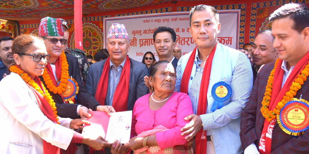 भूमि व्यवस्था, सहकारी तथा गरिबी निवारणमन्त्री बलराम अधिकारीबाट त्यहाँका पुर्जाविहीन नागरिकलाई जग्गाधनी प्रमाणपुर्जा वितरण गरिएको हो । अब बाँकी काम निरन्तर जारी रहेको गाउँपालिकाले जनाएको छ ।