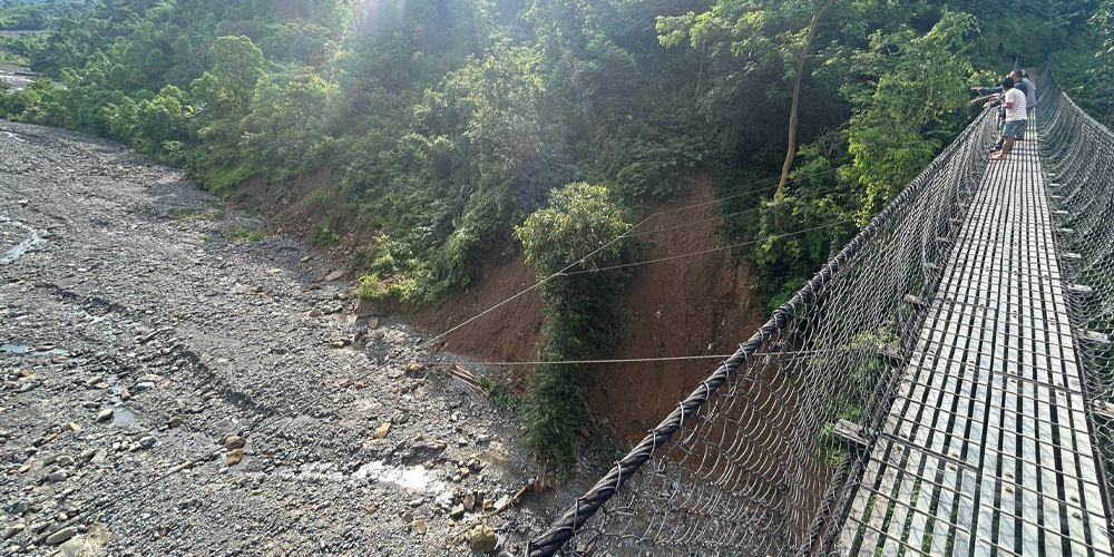 अविरल वर्षासँगै सेउती खोलामा आएको बाढीका कारण धरान उपमहानगरपालिका–१४ को यायोखा टोल र धरान उपमहानगरपालिका–४ को किरात बस्तीलाई जोड्ने झोलुङ्गे पुलको पूर्वी भाग क्षतिग्रस्त भएको छ ।
