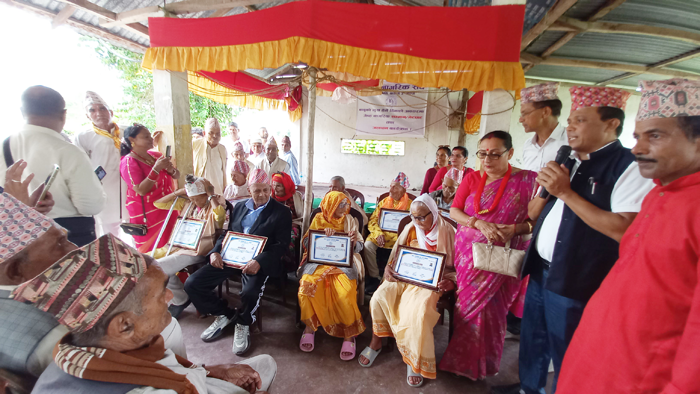 कार्यक्रममा वडामा स्थाई रुपमा बसोवास गर्ने जेष्ठ नागरिक हरु मध्ये ज्येष्ठताको आधारमा ९ जान जेष्ठलाई सम्मान गरिएको थियो । यसरी सम्मानीत हुनेहरुमा हरमाया पौडेल (१०१ वर्ष) इन्द्र छायाँ पोखरेल (१०१ वर्ष) , ओमनाथ भट्टराई (९७ वर्ष) , देबीभक्त बजगाई (९३ वर्ष) , गङ्गाराम धिताल (९३ वर्ष), केरे खड्क कुमारी दाहाल (८९ वर्ष), मोतीमाया लिम्बु (८९ वर्ष) ,सीतादेबी भठ्ठराई (८४ वर्ष) र नर बहादुर कामी (८२ वर्ष)लाई खादा ,ठाका टोपी र सम्मान पत्र द्घारा सम्मान गरिएको थियो ।