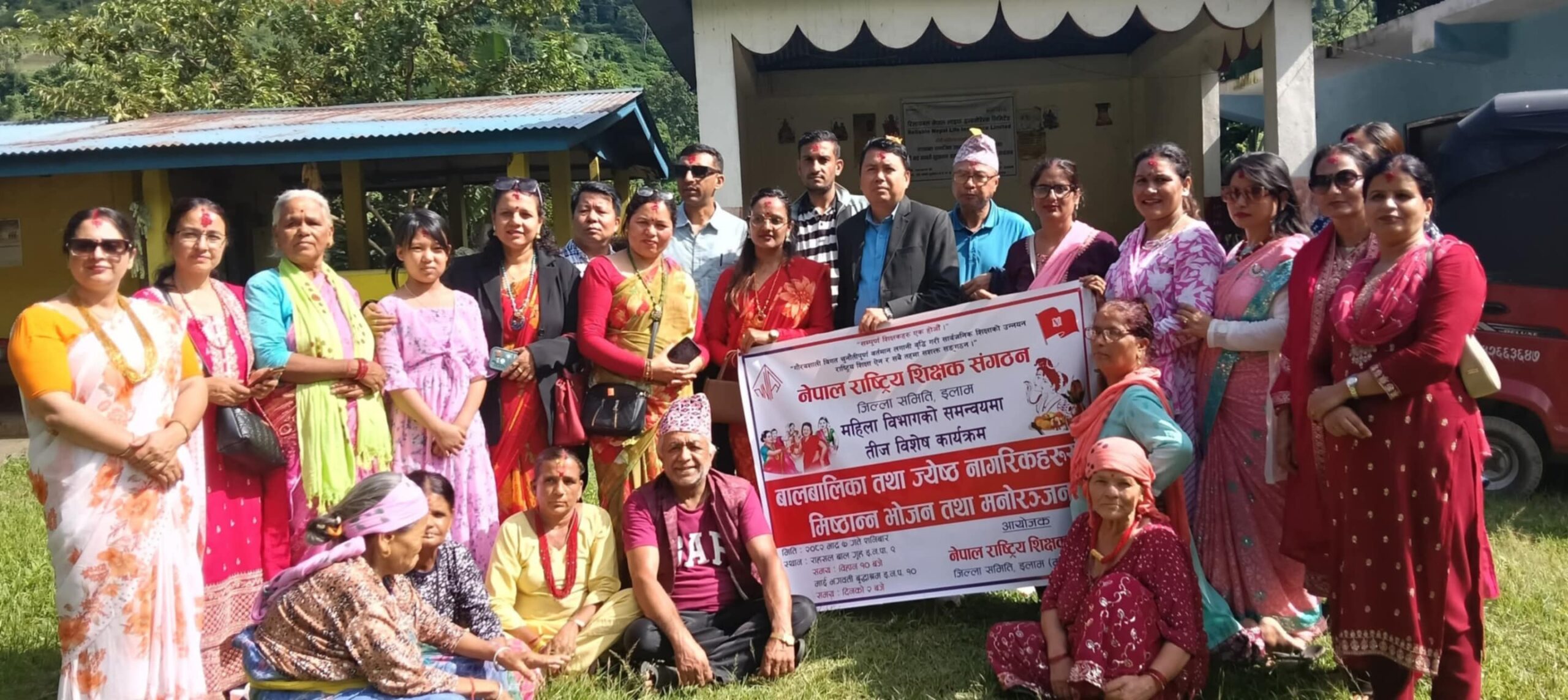 नेपाल राष्ट्रिय शिक्षक संगठन जिल्ला समिति इलाम महिला बिभागले तिज विशेष कार्यक्रम अन्तर्गत बालबालिका तथा ज्येष्ठ नागरिकहरु संग मिष्ठान्न भोजन तथा मनोरञ्जन कार्यक्रम सप्पन्न गरेको छ ।