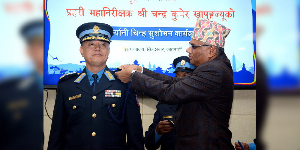 नवनियुक्त प्रहरी महानिरीक्षक चन्द्रकुवेर खापुङले आज दर्ज्यानी चिन्ह् लगाउनुभएको छ । सिंहदरबारस्थित गृह मन्त्रालयमा आयोजित समारोहबीच गृहसचिव गोकर्णमणि दुवाडीले उहाँलाई दर्ज्यानी चिन्ह लगाइदिनुभएको हो ।
