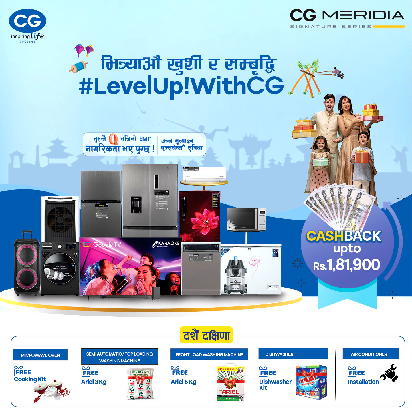 यस अभियान अन्तर्गत ग्राहकहरूले अत्याधुनिक सीजी तथा ऋन् ःभचष्मष्ब क्ष्नलबतगचभ क्भचष्भक का उत्पादनहरूमा रु.एक लाख ८१ हजार नौ सयसम्मको आकर्षक क्यासब्याक, विशेष उपहारहरू तथा बहुपक्षीय सुविधा प्राप्त गर्न सक्ने कम्पनीले जनाएको छ ।