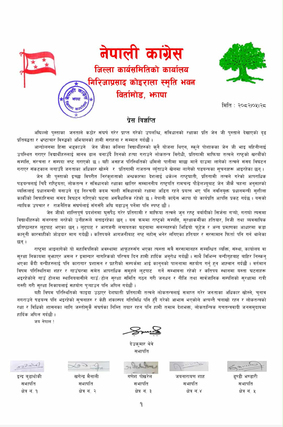 नेपाली काङ्ग्रेस झापाका सभापति, पाचवटा क्षेत्रीय, दशवटा प्रदेशसभा क्षेत्रीय र १५ वटै गाउँ– नगर सभापतिहरुले संयुक्त बिग्यप्ती जारी गर्दै संसद विघटनको निर्णय असम्बैधानिक भएको ठहर गर्दै यश कार्यप्रती आपत्ति प्रकट गरेको हो । “संसद बिगठन गर्नुभन्दा पहिला संविधान संशोधन गर्न प्रतिनिधिसभाको बैठक तत्काल बोलाउने ।