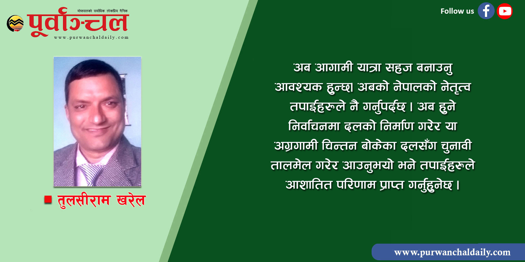 अबका दिनमा भ्रष्टाचारलाई नियन्त्रण गरेर एकजुट भएर काम गर्न सक्नुभयो भने दशदेखि पन्ध्र वर्षभित्र दक्षिण एसियाको उत्कृष्ट, बस्न लायकको देशको रुपमा हामीले हाम्रो देशलाई देख्न पाउनेछौं । आमनेपालीको चाहना नै यही छ कि हाम्रा आगामी पुस्ताले सामान्य रोजगारीको निमित्त विदेशमा गएर लास बनि बाकसमा फर्कनु नपरोस् । सबैको जय होस्, सबैको भलो होस् ।