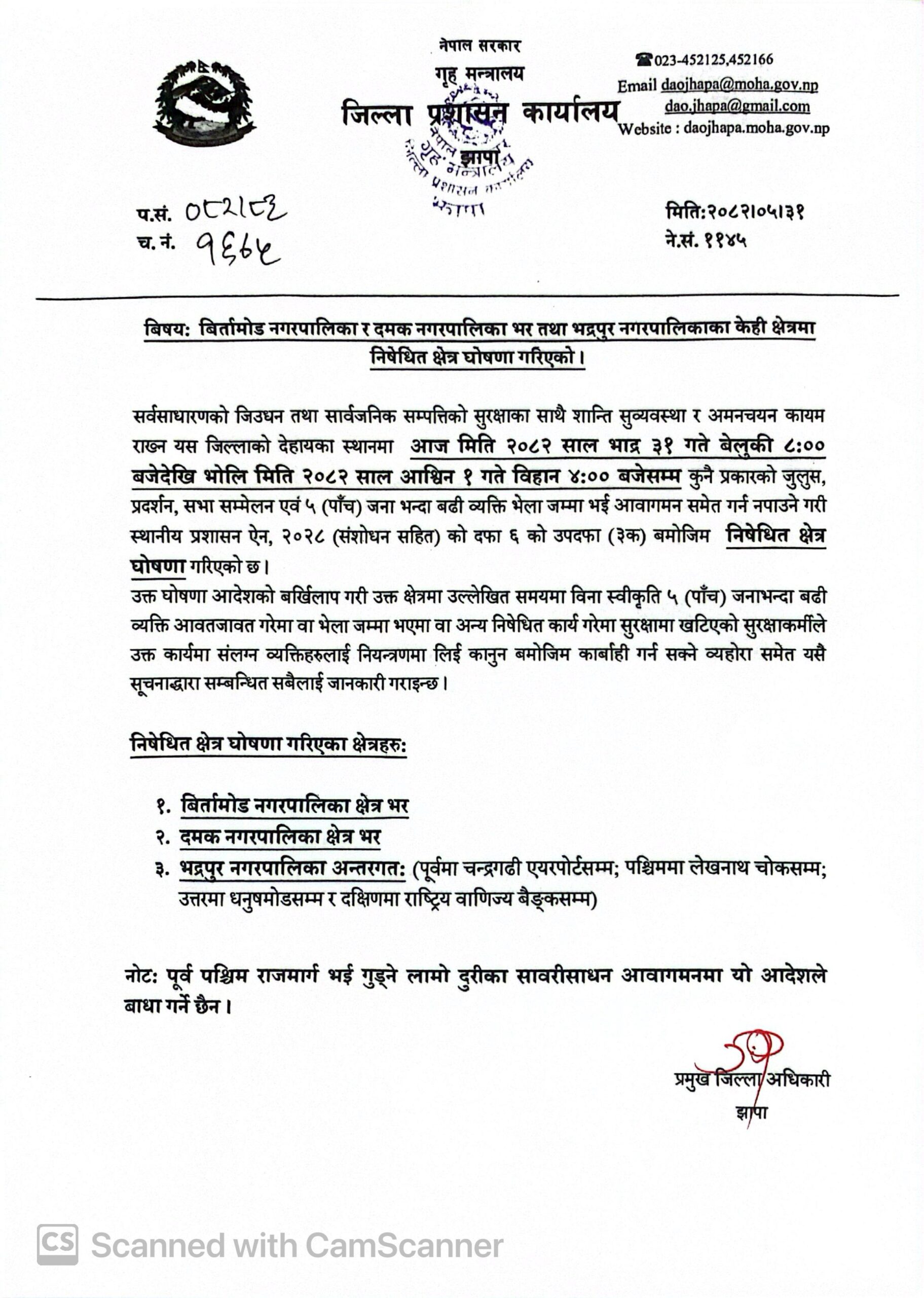 निषेधाज्ञा बिर्तामोड र दमक नगर क्षेत्रभर राति कायम रहन्छ भने भद्रपुरमा पूर्वमा चन्द्रगढी एयरपोटएसम्म पश्चिममा लेखनाथचोकसम्म उत्तरमा धनुषमोडसम्म र दक्षिणमा राष्ट्रिय वाणिज्य बैंकसम्म जारी रहने प्रजिअ अधिकारीले बताए ।