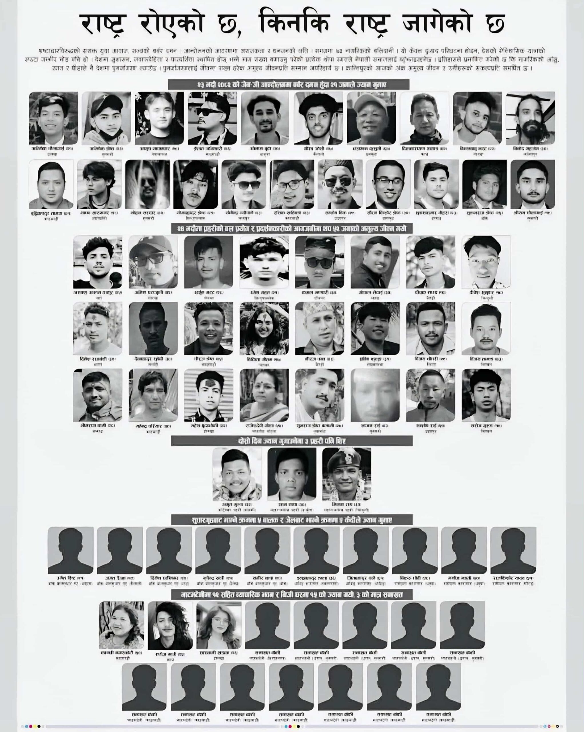 यी नाम र अनुहारहरू केवल पोस्टरमा मात्र सीमित हुने छैनन् । यिनीहरू इतिहासको पानामा अमर हुनेछन् । जब आगामी पुस्ताले नेपालको कथा पढ्नेछन्, उनीहरूले यी अनुहारहरू देख्नेछन् र सोध्नेछन् -“यी किन मरे ?”