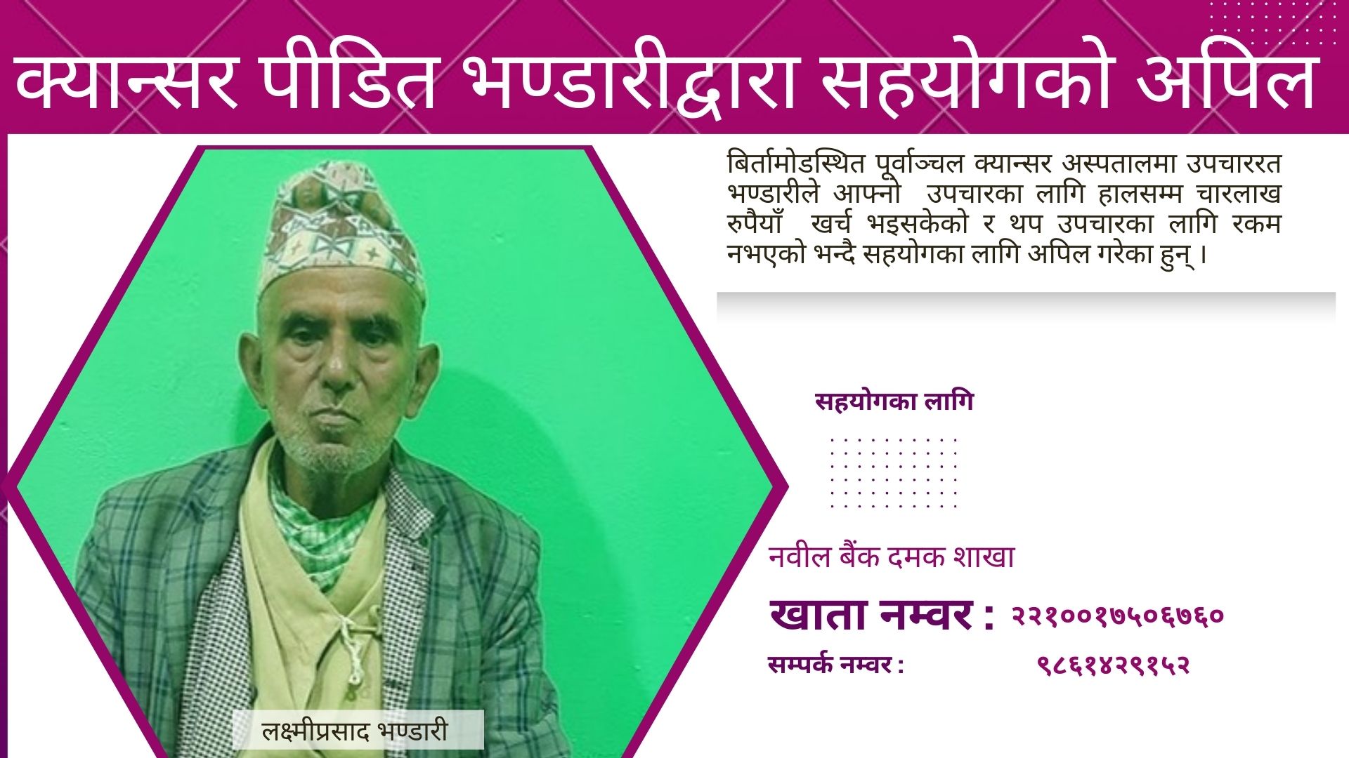 बिर्तामोडस्थित पूर्वाञ्चल क्यान्सर अस्पतालमा उपचाररत भण्डारीले आफ्नो उपचारका लागि हालसम्म चारलाख रुपैयाँ बरावर खर्च भइसकेको र थप उपचारका लागि रकम नभएको भन्दै उनले सहयोगका लागि अपिल गरेका हुन् ।