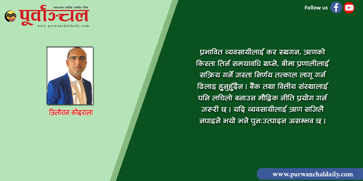 यस्तो अवस्थामा सरकारले कस्तो भूमिका खेल्छ भन्ने कुरा निर्णायक हुन्छ । अहिले आवश्यक छ– वित्तीय र मौद्रिक नीतिमा तत्कालीन परिमार्जन । अर्थतन्त्रलाई कृत्रिम रूपमा मात्र होइन, व्यावहारिक रूपमा पनि फेरि उठाउने उपाय यही हो । प्रभावित व्यवसायीलाई कर स्थगन, ऋणको किस्ता तिर्न समयावधि थप्ने, बीमा प्रणालीलाई सक्रिय गर्ने जस्ता निर्णय तत्काल लागू गर्न ढिलाइ हुनुहुँदैन । बैंक तथा वित्तीय संस्थालाई पनि लचिलो बनाउन मौद्रिक नीति प्रयोग गर्न जरुरी छ । यदि व्यवसायीलाई ऋण सजिलै नपाइने भयो भने पुनःउत्पादन असम्भव छ ।