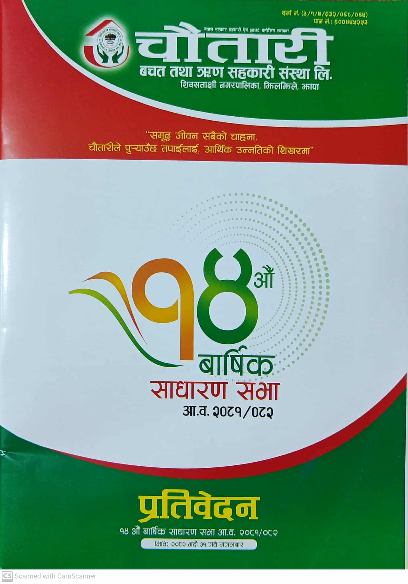 शिवसताक्षी नगरपालिका–८ झिलझिलेमा अवस्थित चौतारी बचत तथा ऋण सहकारी संस्था लिमिटेडको १४औं वार्षिक साधारण सभा शुक्रबार सम्पन्न भएको छ। सभामा संस्थाले सदस्यलाई प्रत्यक्ष लाभ पुग्ने गरी विभिन्न नयाँ कार्यक्रम सार्वजनिक गर्दै गत आर्थिक वर्षको वासलात प्रस्तुत गरेको छ।