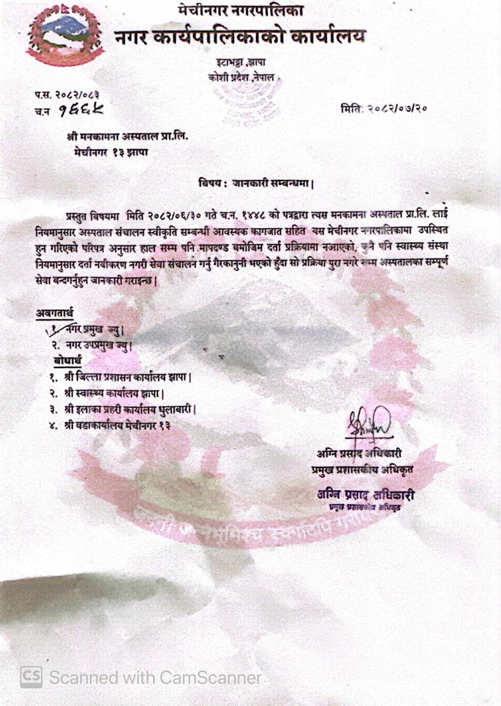 मेचीनगर नगरपालिकाकाले चारआलीमा रहेको मनकामना अस्पतालको सबै सेवाहरु बन्द गर्न अनुरोध गरेको छ । नगरपालिकाले कात्तिक २० गते मेचीनगर–१३ स्थित मनकामना अस्पताल प्रालिलाई अस्पतालले दिने सबै सेवाहरु बन्द गर्न पत्र पठाएको थियो ।