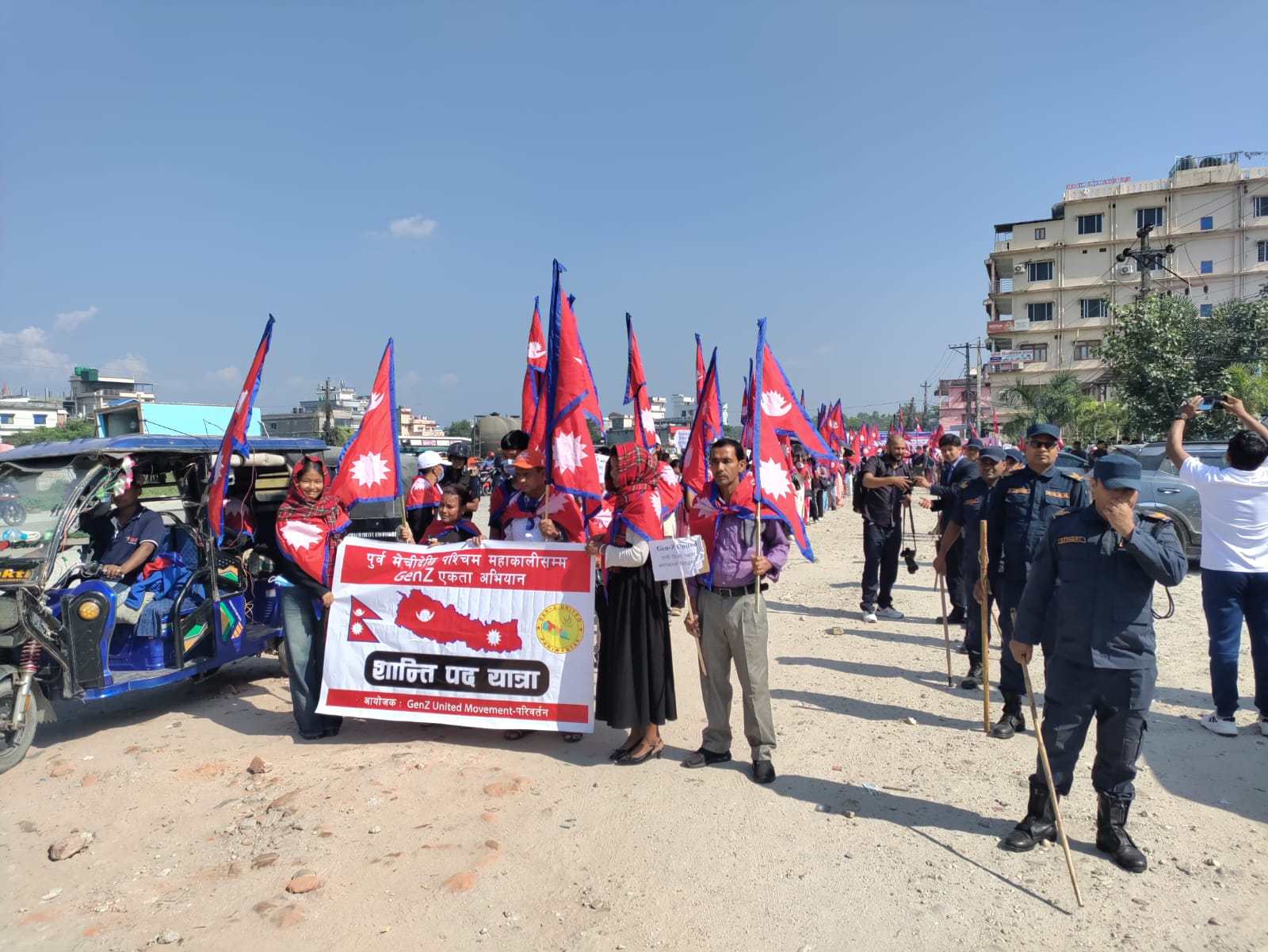 राष्ट्रिय झन्डा बोकेर जेन–जीहरुले बिर्तामोडमा शान्ति पदयात्रा निकालेका छन् ।