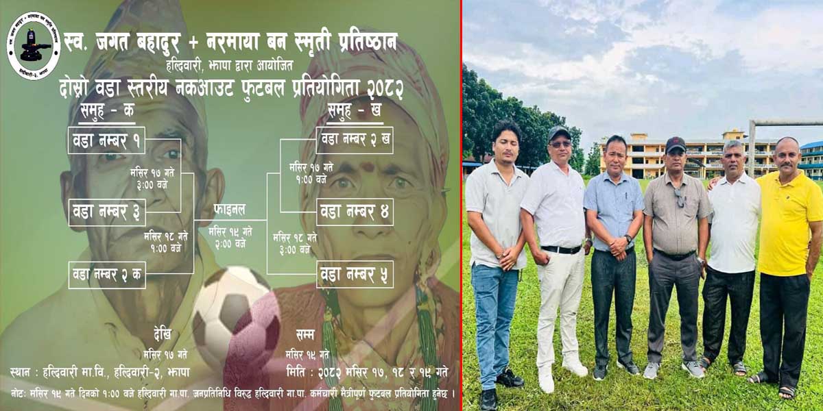 स्व. जगत बहादुर तथा नरमाया बन स्मृती प्रतिष्ठान हल्दीवारीले दोस्रो वडा स्तरीय नकआउट फुटबल प्रतियोगिता २०८२ आयोजना गर्ने भएको छ । प्रतिष्ठानले आगामी मंसीर १७, १८ र १९ गते दोस्रो वडा स्तरीय नकआउट फुटबल प्रतियोगिता गर्न लागेको हो ।