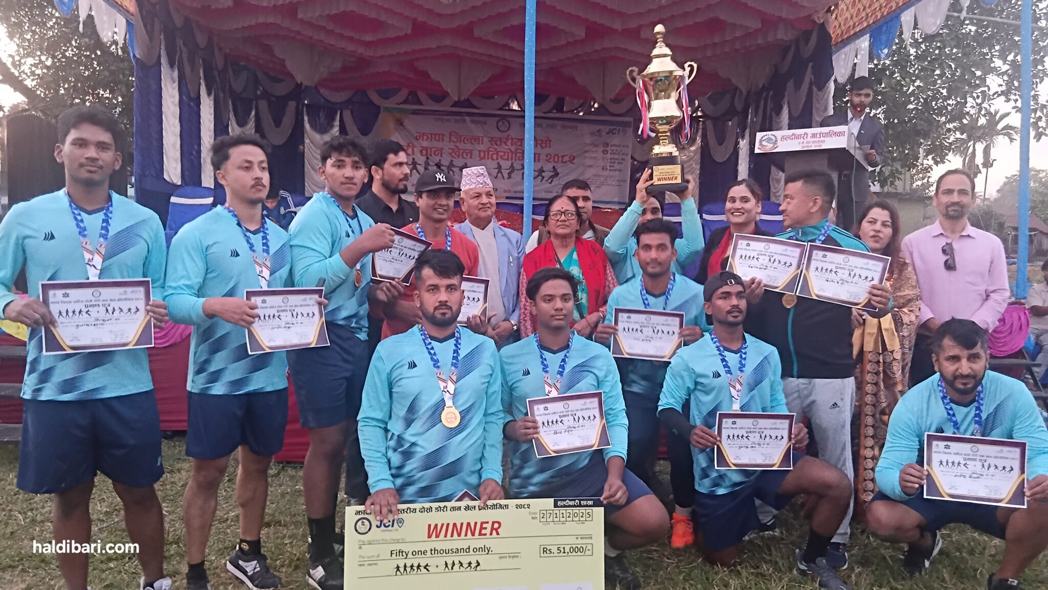 जिल्ला डोरीतान संघ झापा र हल्दीबारी जेसीजको संयुक्त आयोजनामा गरिएको प्रतियोगितामा झापाका तीन विभागीय टिमसहित ११ टिमले प्रतिस्पर्धा गरेका थिए। खेलले स्थानीयको उल्लेख्य आकर्षण पाएको थियो।