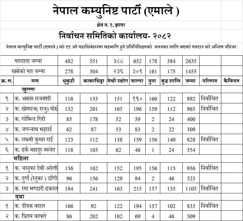 शनिबार सम्पन्न निर्वाचनमा खुलातर्फ खेमराज पोखरेलले ९६५ मत प्राप्त गरी पहिलो स्थानमा रहे। लक्ष्मीकुमार राई ८२८ र असारु राजवंशी ८९२ मतसहित महाधिवेशन प्रतिनिधिमा निर्वाचित भए।