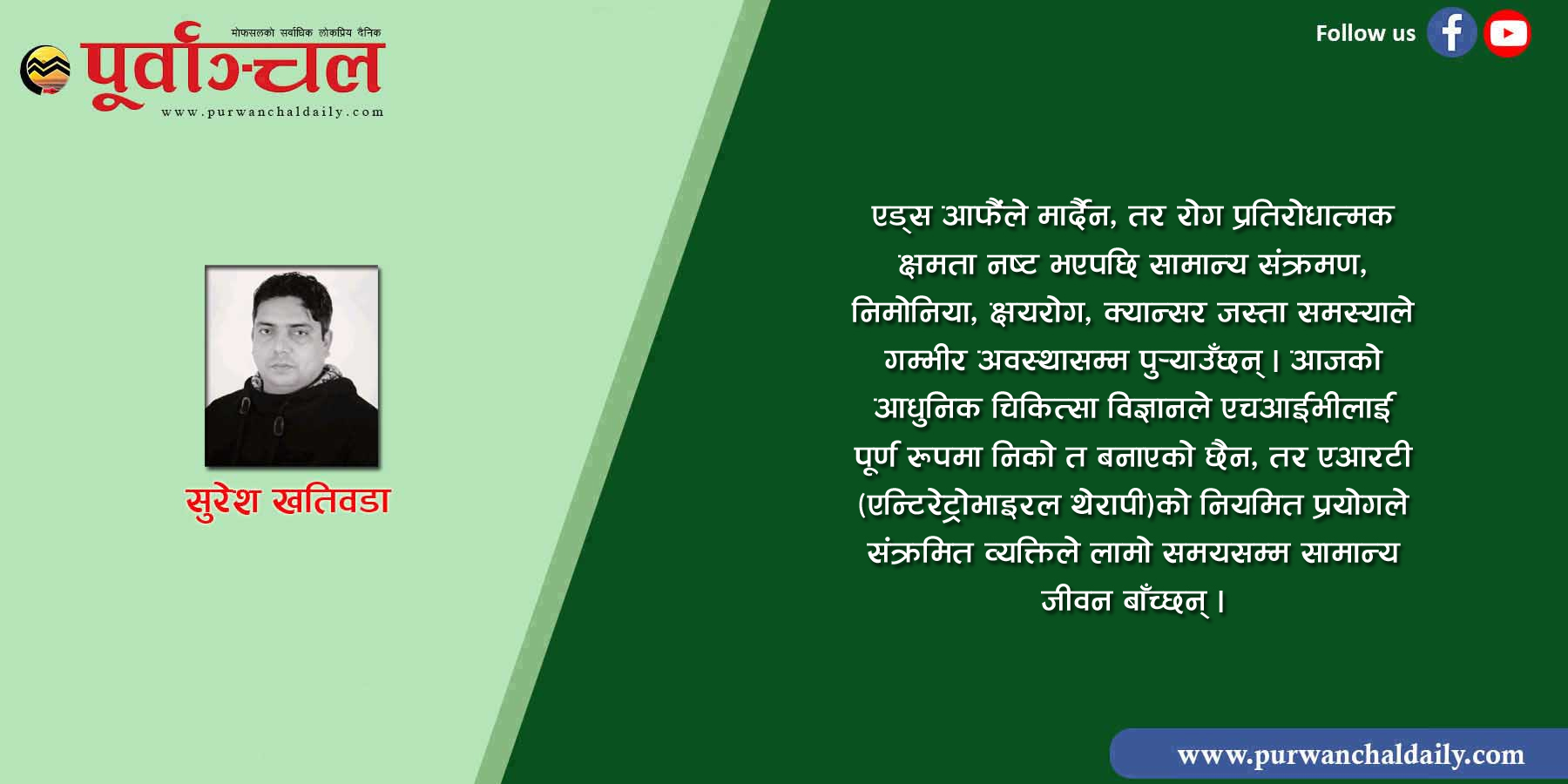 एचआईभी (हुमन इम्युनोडेफिशियन्सी भाइरस) भन्ने भाइरसले शरीरको रोगसँग लड्ने क्षमता कमजोर बनाउने र समयमै उपचार वा सावधानी नअपनाइए यसले एड्स (अक्र्वारिड इम्युनोडेफिशियन्सी सिन्ड्रोम)मा रूप लिन्छ जुन एक अवस्था हो । एड्स आफैंले मार्दैन, तर रोग प्रतिरोधात्मक क्षमता नष्ट भएपछि सामान्य संक्रमण, निमोनिया, क्षयरोग, क्यान्सर जस्ता समस्याले गम्भीर अवस्थासम्म पु¥याउँछन् । आजको आधुनिक चिकित्सा विज्ञानले एचआईभीलाई पूर्ण रूपमा निको त बनाएको छैन, तर एआरटी (एन्टिरेट्रोभाइरल थेरापी)को नियमित प्रयोगले संक्रमित व्यक्तिले लामो समयसम्म सामान्य जीवन बाँच्छन् ।