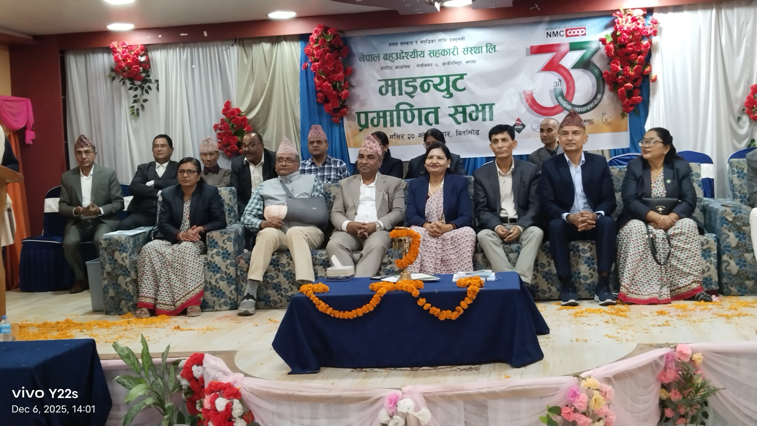 मेचीनगर नगरपालिका -६, काकडभिट्टा केन्द्रीय कार्यालय रहेको सहकारी अभियानमा अग्रणी नेपाल बहुउद्देश्यीय सहकारी संस्था लिमिटेड (एनएमसी) को ३३अौं वार्षिक तथा अन्तिम माइन्युुट प्रमाणिकरण सभा बिर्तामोडमा सम्पन्न भएको छ।
