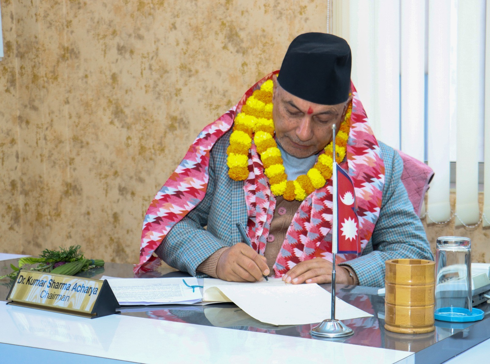प्रेस काउन्सिल नेपालका नवनियुक्त अध्यक्ष डा. कुमार शर्मा आचार्यले आज आइतबारदेखि कार्यभार सम्हाल्नुभएको छ । प्रेस काउन्सिल नेपालको बैठकसम्बन्धी कार्यविधि, २०७१ को २(ङ)अनुसार अध्यक्ष डा. आचार्यले काउन्सिल सदस्यहरूको उपस्थितिमा शपथग्रहण गर्नुभएको थियो । अध्यक्ष डा. आचार्यले शपथग्रहणपश्चात् आजै कार्यकक्षमा गई पदबहाली गर्नुभयो ।