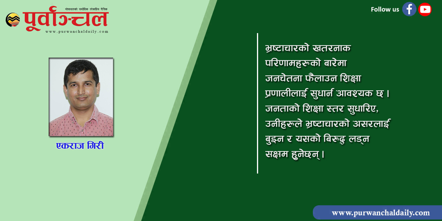 नेपालमा भ्रष्टाचारको समस्या अत्यन्त गहिरो र जटिल भएको छ, जसका कारण सरकारी, सामाजिक र आर्थिक क्षेत्रहरूमा अनगिन्ती चुनौतीहरू उत्पन्न भएका छन् । हामीले भ्रष्टाचारका कारण, यसको गहिरा असर, समस्या, चुनौतिहरू र आगामी दिनमा सरकार, सरोकारवाला अझ युवा पुस्ताको भूमिका लगायत यसका समाधानका उपायहरूमा चिन्तन गर्न जरुरी छ ।