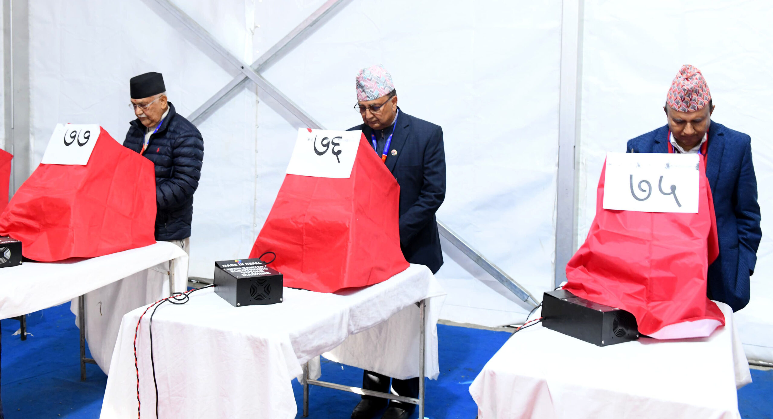 नेपाल कम्युनिष्ट पार्टी (एमाले) को ११औँ महाधिवेशनबाट नयाँ नेतृत्व छनोटका लागि अहिले मतदान भइरहेको छ । काठमाडौँको भृकुटीमण्डपमा जारी मतदानमा पार्टीको केन्द्रीय निर्वाचन आयोगले प्रबन्ध गरेको विद्युतीय भोटिङ मेसिनमा मतदान भइरहेको हो ।