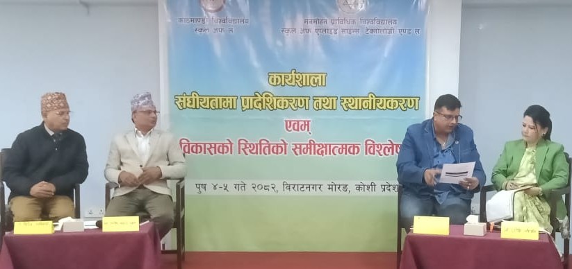 संघियता आएपनि अझै संघले पहिलो अनुसूचीमार रहेका अधिकारहरु हस्तान्तरण नगर्दा केन्द्रिकृत सोच हावी भएकोले साशन सञ्चालन र सेवा प्रवाहको अवस्था पुरानै ढर्रामा रहँदा आठ बर्ष वितिसक्दापनि अझै संघियताप्रति आम नागरिकहरु विश्ववस्त हुन नसकेको काठमाण्डौ विश्विश्वविद्यालयको ‘स्कुल अफ ल’ र ‘मनमोहन प्राविधिक विश्वविद्यालयको स्कुल अफ एप्लाईड साईन्स टेक्नोलोजी एण्ड ल’ ले संघियतामा प्रादेशिकीकरण तथा स्थानियकरणबारे शुक्रबारदेखी विराटनगरमा सुरु गरको दुई दिने कार्यशाला गोष्ठिमा सहभागी विज्ञ र सरोकारवालाहरुले बताएका हुन ।