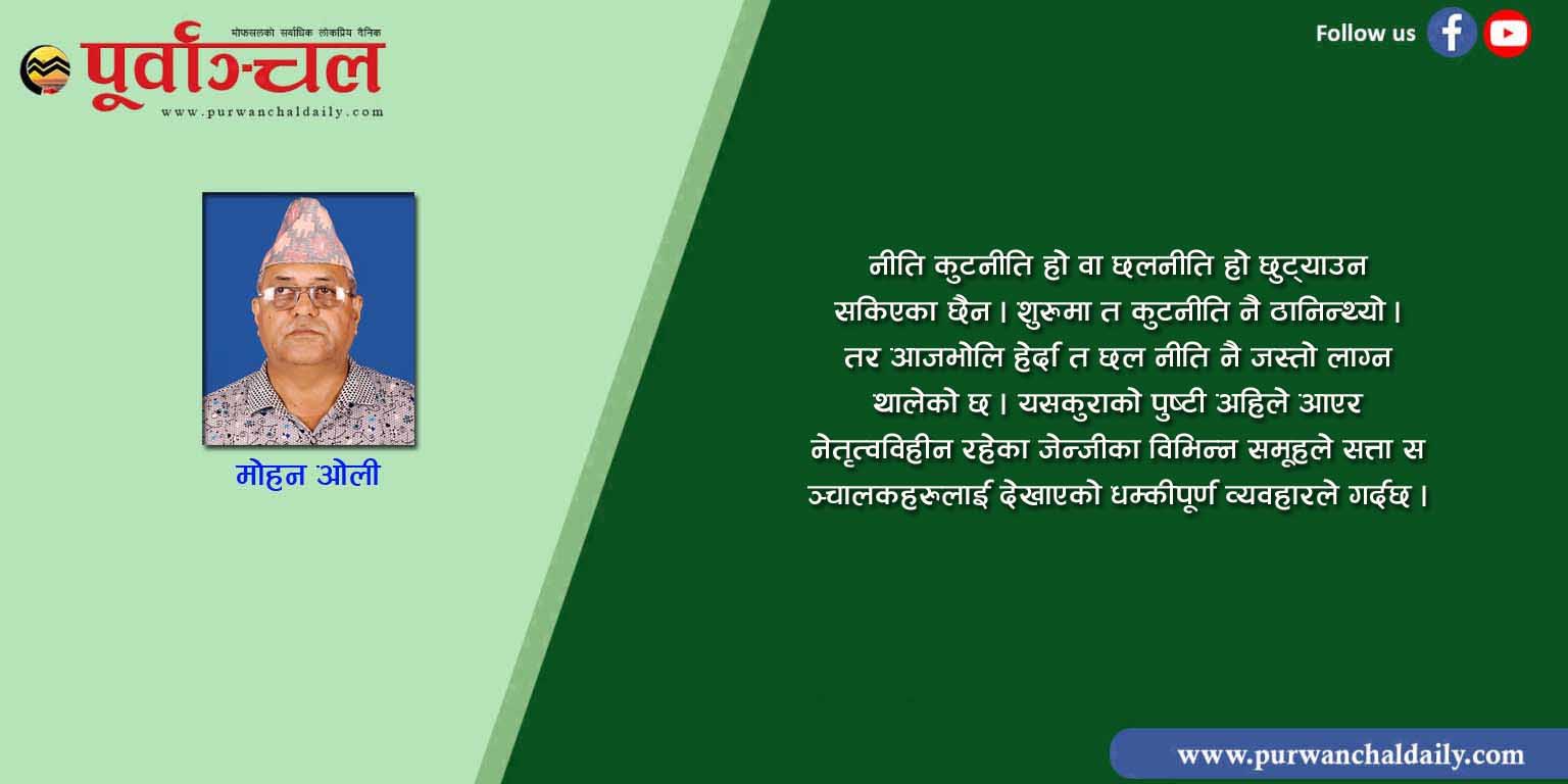 कुटनीति र राजनीति त पक्कै पनि होइन । फेरि राजनीतिक होइन भनौ भने राज्यसत्ता नै उलटपुलट भयो । राज्य सत्ता सञ्चालन गर्ने मात्र नभएर नेपालका ठूला दलका नेताहरु नै केही समय गुप्तवास नै बस्नुपर्ने जस्तो देखियो । फेरी कुटनीतिक होइन भनौ भने उद्देश्य एउटा परिणाम अर्को छ भने कुटनीति किन नभन्ने ? छल नीतिको त कुरै छाडौ । आन्दोलन जेन्जी सन् १९९७ देखि २०१२ भित्र जन्मिएका १३ देखि २८ वर्षभित्रकाबाट गर्ने थियो । अनि सत्ताको नेतृत्व भने जेनवुमर्स, जेनएक्स र जेनवाइ जो सन् १९४६ देखि १९८० भित्र विभिन्न चरणमा जन्मिएका ४५ देखि ७९ वर्षभित्रका बाट भयो । यो नीति कुटनीति हो वा छलनीति हो छुट्याउन सकिएको छैन । शुरुमा त कुटनीति नै ठानिन्थ्यो । तर आजभोलि हेर्दा त छल नीति नै जस्तो लाग्न थालेको छ । यसकुराको पुष्टी अहिले आएर नेतृत्वविहीन रहेका जेन्जीका विभिन्न समूहले सत्ता सञ्चालकहरुलाई देखाएको धम्कीपूर्ण व्यवहारले गर्दछ ।