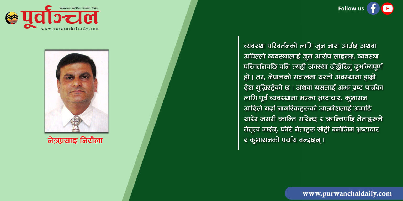 मेरो धारणा भने प्रत्येक पटक भएको क्रान्तिको सफलतापछि जुन व्यवस्था परिवर्तन हुन्छ, जनताहरुले जसरी बलिदानी पूर्ण संघर्ष गरिदिएका हुन्छन्, त्यसलाई बिर्सिएर नेतृत्व वर्गहरु राष्ट्र र जनताभन्दा दलगत तथा व्यक्तिगत, गुटगत स्वार्थमा डुबनाले हाम्रो देशमा भएका प्रत्येक सफल क्रान्तिपछि भएको नयाँ व्यवस्थाको संस्थागत हुन नसकेको हो भन्ने मेरो बुझाई छ । व्यवस्था परिवर्तनको लागि जुन नारा आउँछ अथवा अघिल्लो व्यवस्थालाई जुन आरोप लाइन्छ, व्यवस्था परिवर्तनपछि पनि त्यही अवस्था दोहोरिनु दुर्भाग्यपूर्ण हो । तर, नेपालको सवालमा यस्तो अवस्थामा हाम्रो देश गुज्रिरहेको छ । अथवा यसलाई अझ प्रष्ट पार्नका लागि पूर्व व्यवस्थामा भएका भ्रष्टाचार, कुशासन आदिले गर्दा नागरिकहरूको आक्रोशलाई अगाडि सारेर जसरी क्रान्ति गरिन्छ र क्रान्तिपछि नेताहरुले नेतृत्व गर्छन्, फेरि नेताहरु सोही बमोजिम भ्रष्टाचार र कुशासनको पर्याय बन्दछन् ।