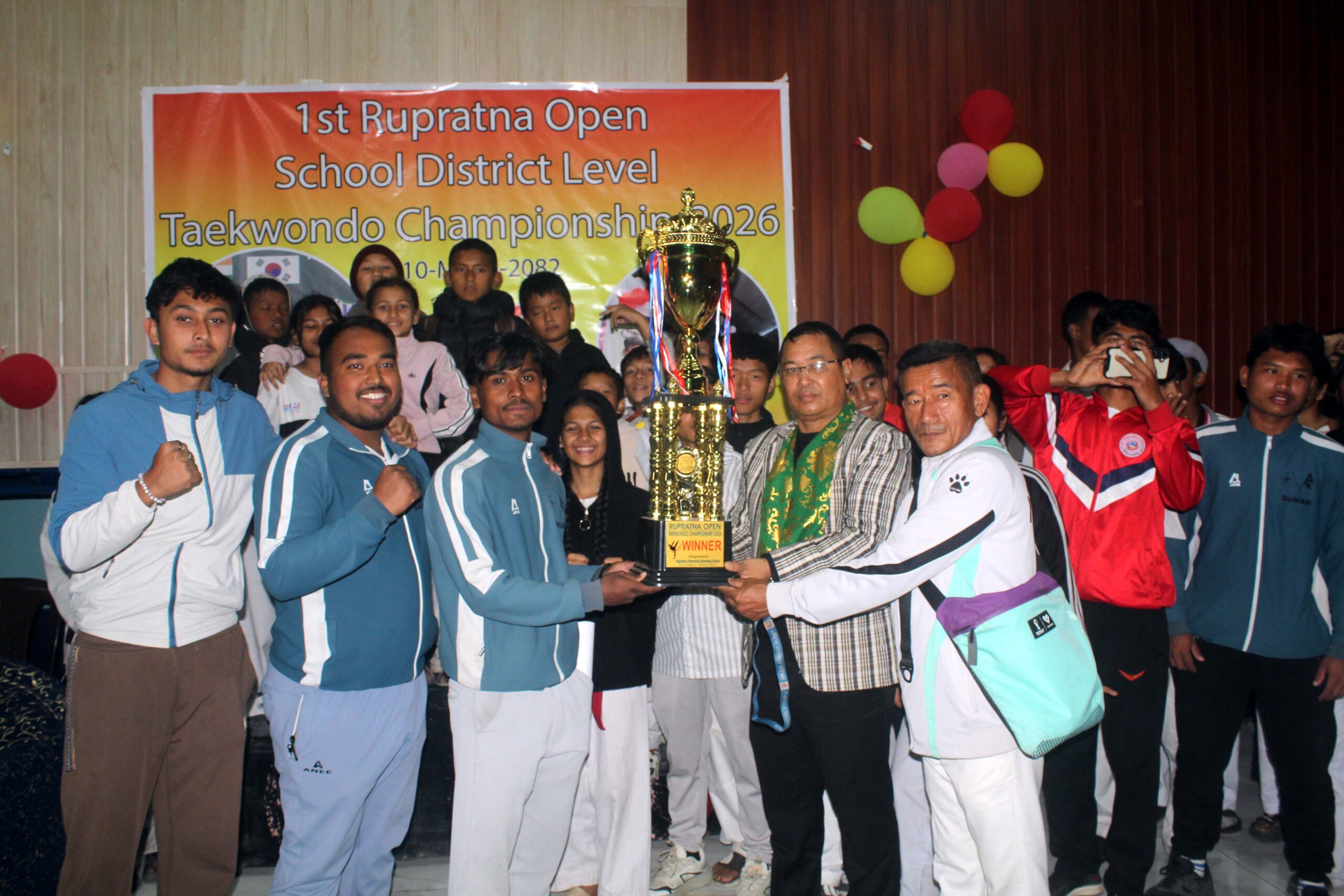 अर्जुनधारा, विद्यालय तहमा तेक्वान्दो खेलको प्रबद्र्धन एवम् खेलाडी उत्पादन गर्ने उद्देश्यले आयोजित प्रथम रुपरत्न खुला पुरुष तथा महिला अन्तर विद्यालय जिल्लास्तरिय तेक्वान्दो च्याम्पियनसीप–२०८२को उपाधि झापा मेरीगोल्डले जितेको छ ।