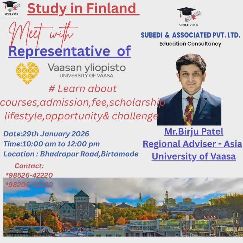 झापाको बिर्तामोडमा रहेको सुवेदी एण्ड एसोशिएट कन्सल्टेन्सीले बिहीबार फिनल्याण्डका विश्विविद्यालयका बारेमा विदार्थीहरुलाई जानकारी दिनेभएको छ ।