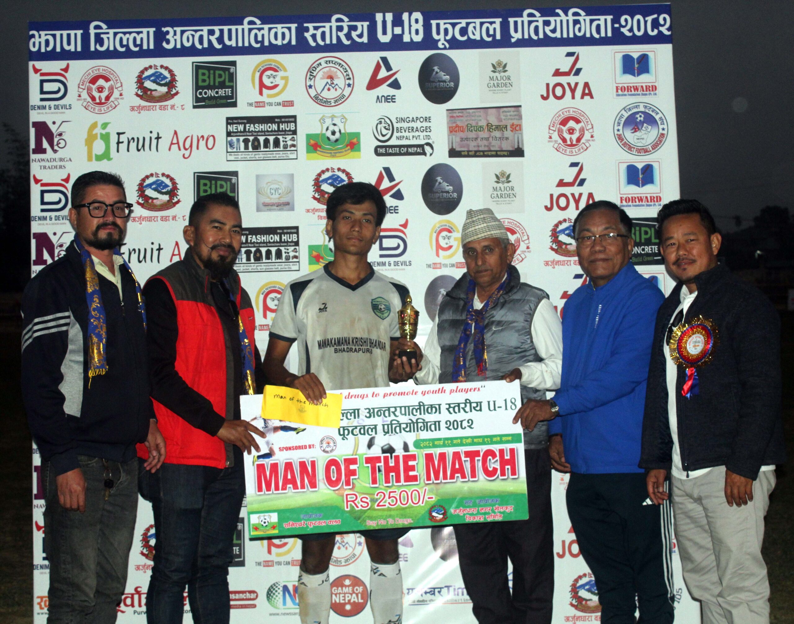 उनलाई कार्यक्रमका विशेष अतिथिद्वय झापा जिल्ला फुटबल संघका अध्यक्ष भगिरथ आले “मामा” र स्थानीय बिल्डकन इण्डस्ट्रिज प्रा.लि.का अध्यक्ष भीमचन्द्र भट्टराई, अर्जुनधारा नगर खेलकुद विकास समितिका अध्यक्ष सुरेन्द्रबहादुर धिमाललगायतले नगद पुरस्कार दुई हजार पाँच सयसहित ट्रफी प्रदान गरेका थिए । उक्त पुरस्कार बिर्तामोडस्थित सुप्रीम सप्लायर्सले सौजन्य गरेको हो ।