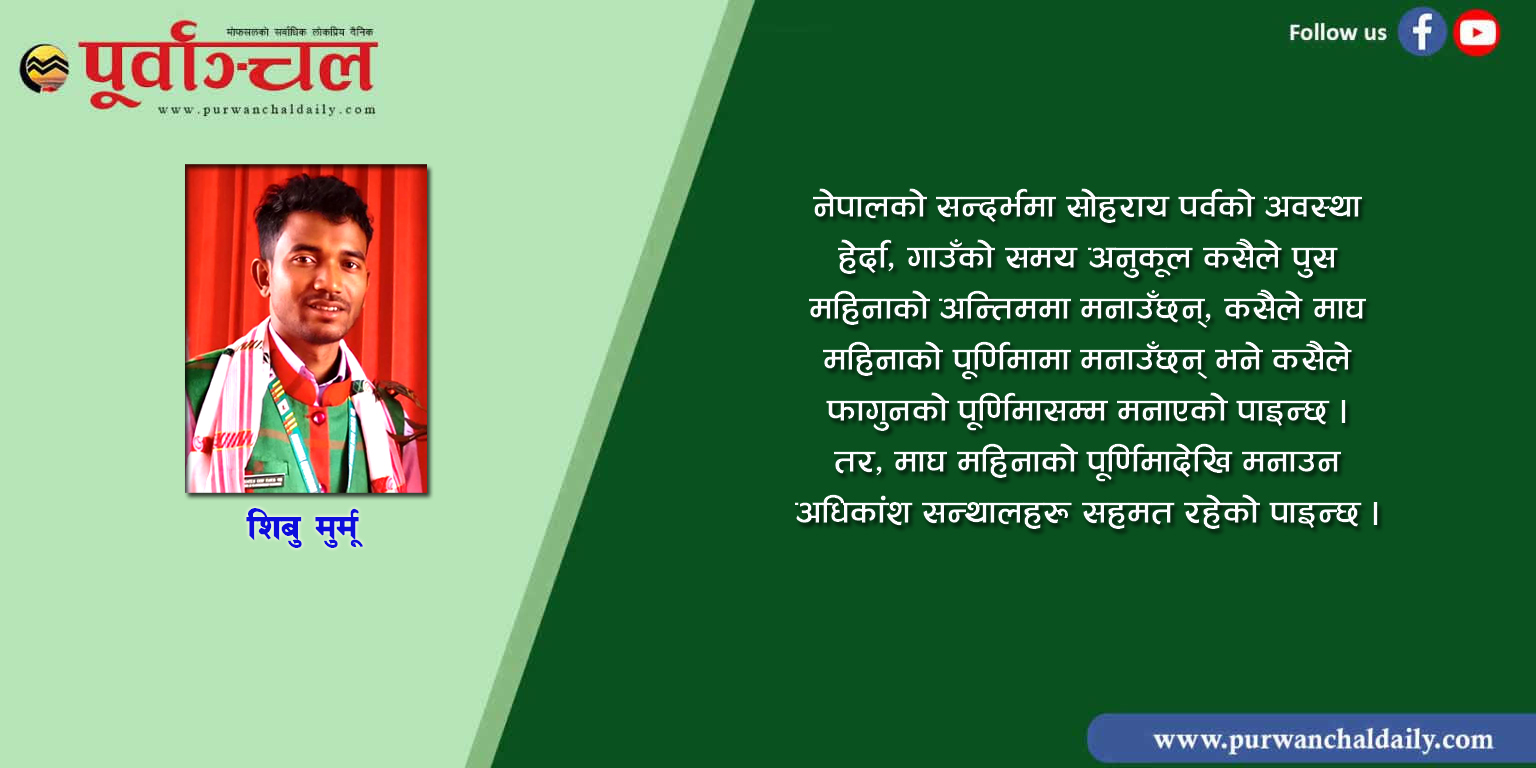 यसै कुरामा आधारित रहि सन्थालहरुको जातीय संस्था नेपाल सन्थाल आदिवासी उत्थान संघ केन्द्रिय समिति पहलमा मिति २०८१ चैत १९ गते कोशी प्रदेश सरकारद्वारा प्रकाशित ‘प्रदेश राजपत्र’मा सन्थाल समुदायलाई सोहराय पर्व– माघ शुक्ल पुर्णिमा माघ १८ गते आइतबार दिन एकदिन सार्वजनिक बिदा दिएको छ । झापा मोरङको स्थानीय केही तहहरूले स्थानीय विदा गरेको छ । सोहराय पर्व माघ शुक्ल पुर्णिमा अर्थात यसपाली माघ १८ गतेदेखि शुरु गरी माघ २३ गतेसम्म छ दिनमा विधिगत रुपमा यो पर्व सन्थालहरूको धर्म ‘सारना’ (बिदिन) धर्म अन्तर्गत रहेर यो पर्व मनाइन्छ ।