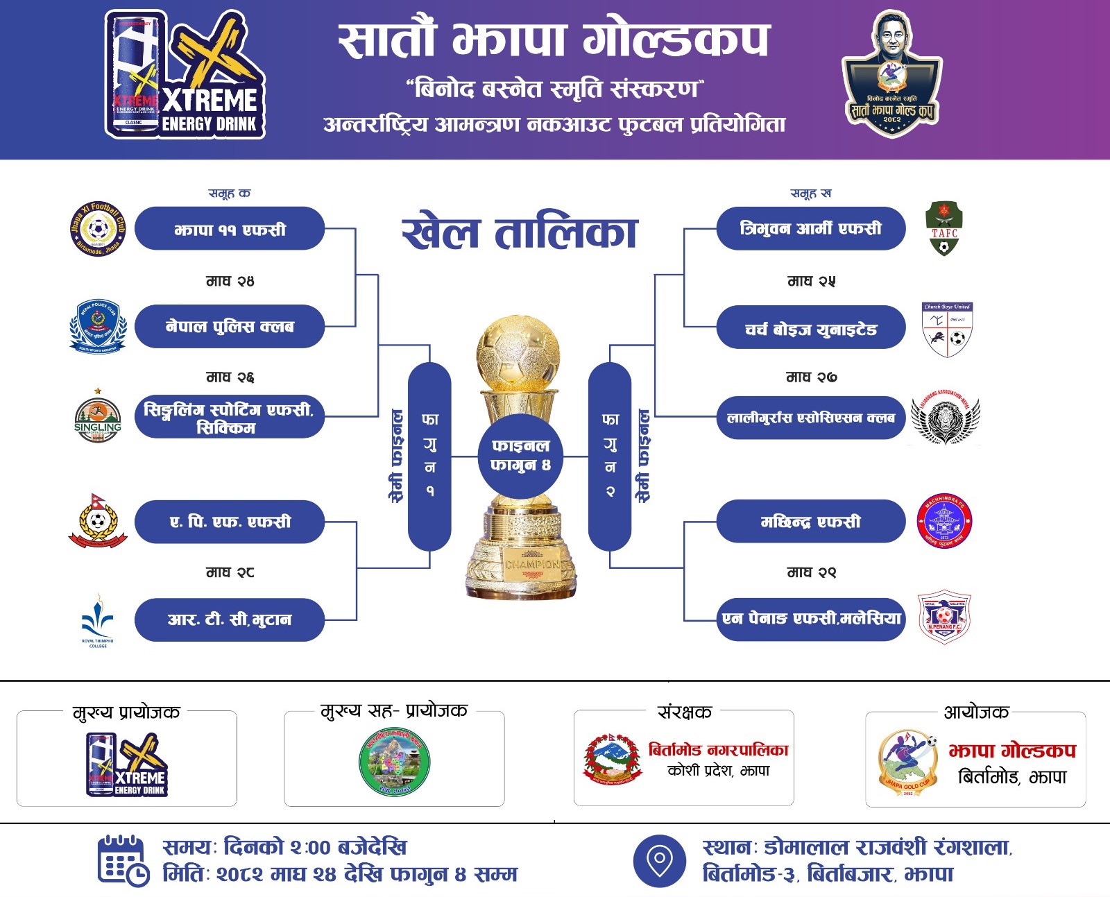 एक्स्ट्रिम सातौँ झापा गोल्डकप विनोद बस्नेत स्मृति संस्करणको खेल तालिका सार्वजनिक गरिएको छ । आयोजक झापा गोल्डकपले आज सामाजिक सञ्जालमार्फ खेल तालिका सार्वजनिक गरेको हो ।