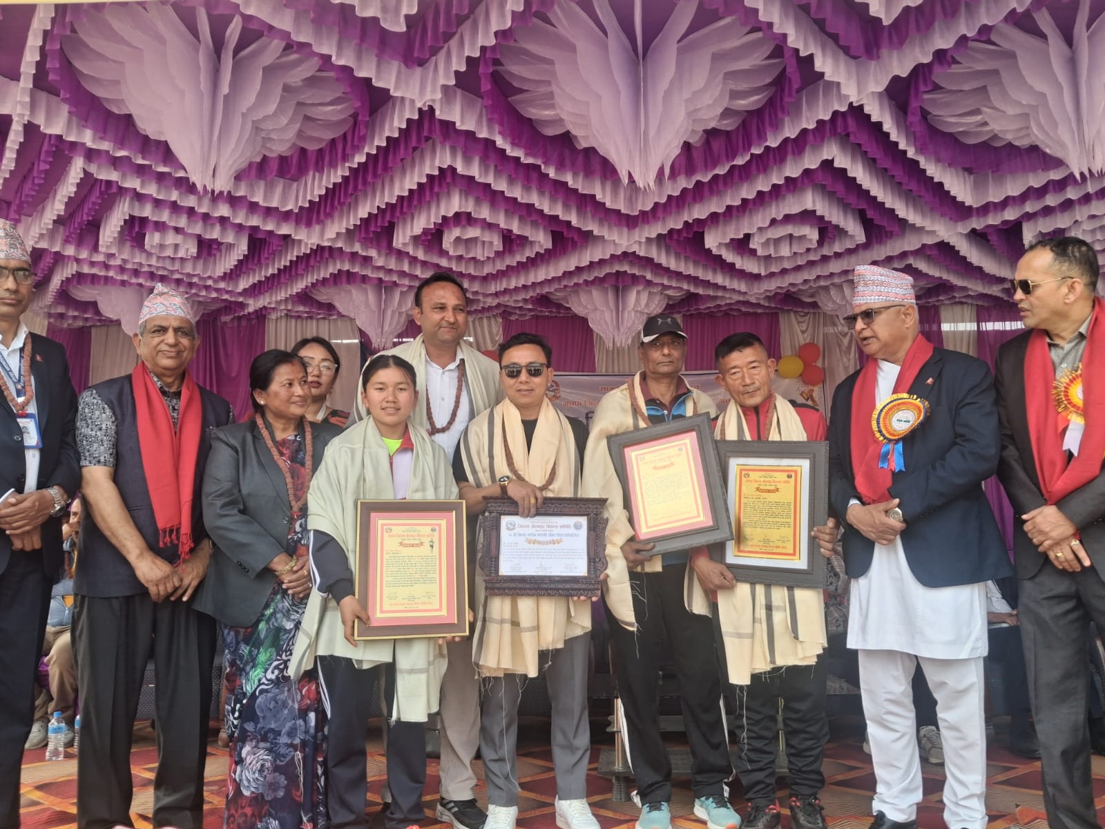 जिल्ला खेलकुद विकास समिति झापाका अध्यक्ष भेषराज भण्डारी ‘प्रशान्त’को अध्यक्षतामा आयोजित समारोहमा खेलकुद क्षेत्रमा योगदान पुर्याउने खेलाडी, प्रशिक्षक तथा सामाजिक संघ–संस्थालाई सम्मान गरिएको थियो। तेक्वान्दो प्रशिक्षक हरिबहादुर भुजेल, एथलेटिक्स प्रशिक्षक गोपाल यादव, अल्ट्राधाविका पुष्पा शेर्मा, झापा महिला गोल्डकपका अध्यक्ष सन्तोष थोप्रा तथा संस्थागत रूपमा झापा उद्योग वाणिज्य संघलाई सम्मान गरिएको हो। सम्मान प्रमुख अतिथि मुख्यमन्त्री कार्की, गौरादह नगरपालिकाका प्रमुख छत्रपति सुवेदी र गौरीगञ्ज गाउँपालिकाकी अध्यक्ष फूलवती राजवंशीलगायतले दोसल्ला र सम्मानपत्र प्रदान गरे। झापा उद्योग वाणिज्य संघको सम्मानपत्र महासचिव सुमन्त मौलीले ग्रहण गरे।