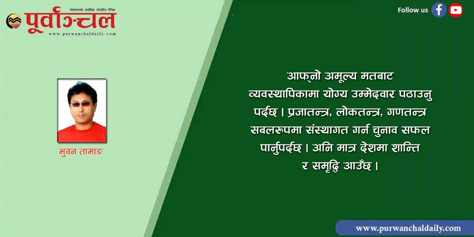 फागुन २१ को आमनिर्वाचन आइ नै सक्यो । निर्वाचन आयोगको अनुमति अनुसार राजनीतिक दलका नेताहरु चुनाव प्रचारप्रसारमा व्यस्त देखिएका छन् । आ–आफ्ना चुनावी घोषणापत्र प्रस्तुत गर्दै भावी योजनाहरु सुनाउँदैछन् । मतदाताहरु पनि चाखपूर्वक सुनिरहेका र नेताहरुलाई प्रश्न पनि गरिरहेका छन् ।