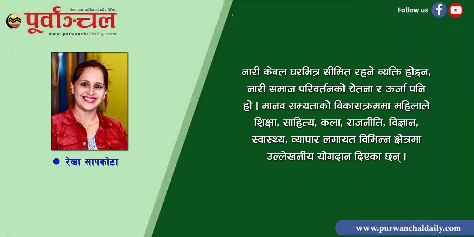 नारी परिवारको दरिलो खम्बा मात्र होइन, समाजको मेरुदण्ड पनि हो । जन्मदेखि जीवनका हरेक मोडमा नारीले त्याग, माया, संघर्ष, समर्पण र सहनशीलता बोकेकी हुन्छिन् । आमा, छोरी, पत्नी, बुहारी जस्ता अनेक भूमिकामा रहेर नारीले परिवार, समाज र राष्ट्रलाई अगाडि बढाउने अदृश्य शक्ति प्रदान गरेकी हुन्छिन् । त्यसैले नारीलाई समाज निर्माणको महŒवपूर्ण आधार मानिन्छ ।
