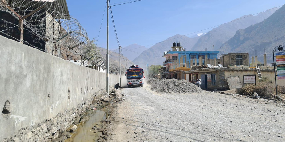 निर्माणाधीन सडकअन्तर्गत जोमसोमस्थित नेपाली सेनाको ब्यारेक अगाडि कालोपत्रका लागि फिलिङ गर्न माटो थुपारिएकाले सवारी आवागमनमा समस्या परेको छ । त्यसैगरी कालोपत्र ढिलाइ हुँदा त्यहाँस्थित सेनालाई धुवाँधुलोले पनि असर पुर्याएको देखिन्छ ।