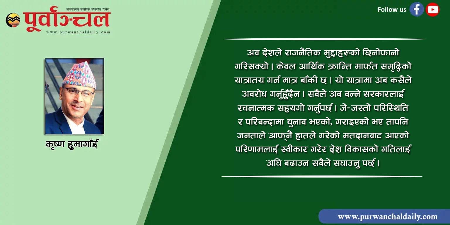 अब देशले राजनैतिक मुद्दाहरुको छिनोफानो गरिसक्यो । केवल आर्थिक क्रान्ति मार्फत समृद्धिको यात्रातय गर्न मात्र बाँकी छ । यो यात्रामा अब कसैले अवरोध गर्नु हुँदैन । सबैले अब बन्ने सरकारलाई रचनात्मक सहयगो गर्नुपर्छ । जे जस्तो परिस्थिति र परिबन्दामा चुनाव भएको, गराइएको भए तापनि जनताले आफ्नै हातले गरेको मतदानबाट आएको परिणामलाई स्वीकार गरेर देश बिकासको गतिलाई अघि बढाउन सबैले सघाउनु पर्छ । लोकतन्त्रका आधारभूत मूल्य, मान्यता मानव अधिकार, प्रेस स्वतन्त्रता, अभिब्यक्ति स्वतन्त्रता, पेशा ब्यवसाय गर्ने स्वतन्त्रता लगायत जनअधिकारहरु हनन् नगरेसम्म, देश र जनतालाई मर्का पर्ने काम नगरेसम्म कोही कसैले जातिवाद र बंशवाद प्राप्तिका लागि आन्दोलन गरेर समृद्धिको यात्रालाई अवरोध पु–याउने कुचेष्टा गर्नु हुँदैन ।