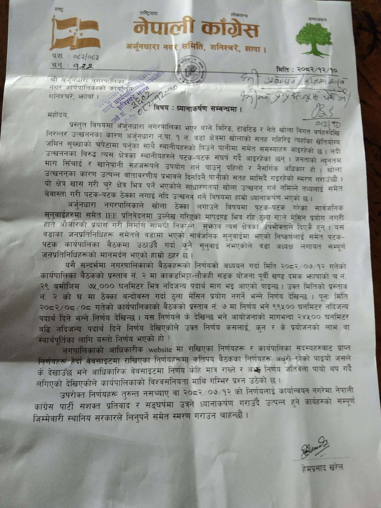 नगर समिति सभापति हेमप्रसाद खरेलद्वारा जारी पत्रमा अर्जुनधारा–१ क्षेत्रमा सञ्चालित खोला उत्खनन कार्यले स्थानीय जनजीवनमा नकारात्मक प्रभाव पारेको उल्लेख गरिएको छ । विशेषगरी बस्ती नजिकैबाट भइरहेको उत्खननका कारण खेतीयोग्य जमिनमा क्षति पुग्नुका साथै वातावरणीय जोखिमसमेत बढेको जनाइएको छ।