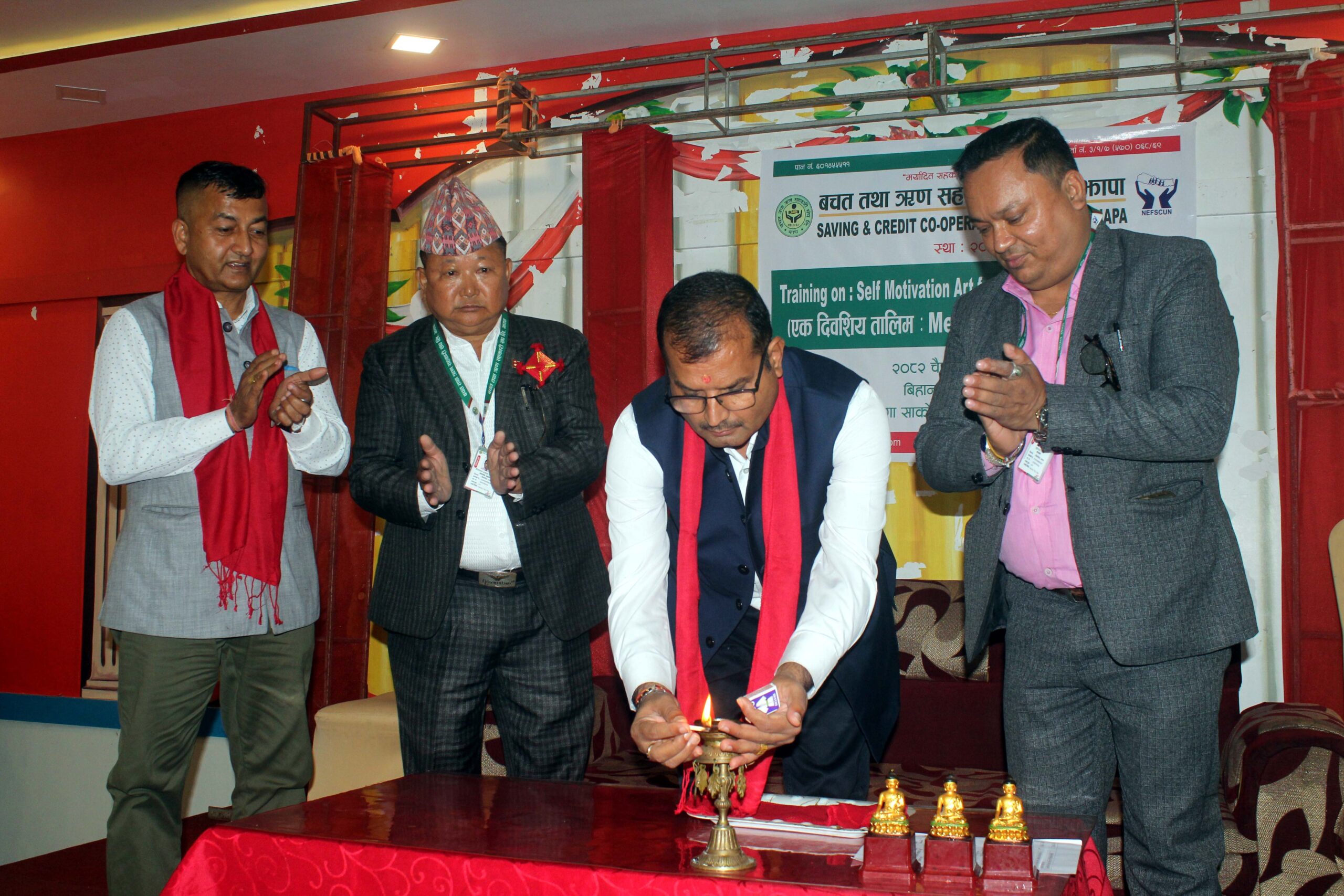 ६९ औं राष्ट्रिय सहकारी दिवसको सन्दर्भमा बचत तथा ऋण सहकारी संस्था लिमिटेड झापाको आयोजनामा मूल्यवान सदस्यलाई सन्तुष्ट पार्नका लागि आत्म–प्रेरणात्मक कला सम्बन्धी एक दिने तालिम बिहीबार सम्पन्न भएको छ ।